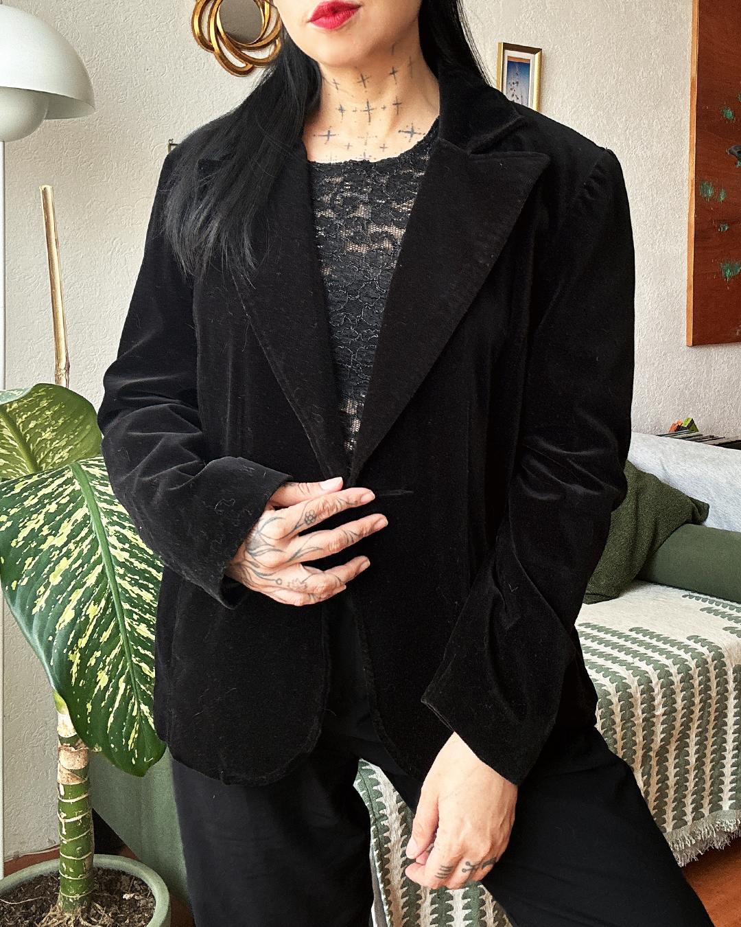 Increíble blazer estructurado confeccionado en terciopelo negro. Solapas anchas y un corte ligeramente oversize que aporta una silueta clásica pero moderna. El forro es poliéster, el exterior es 100% algodón.