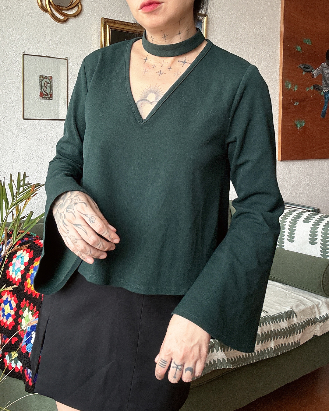 Blusa en tono verde bosque, con escote en “V” y cuello tipo choker integrado. Manga amplia con caída y corte recto.