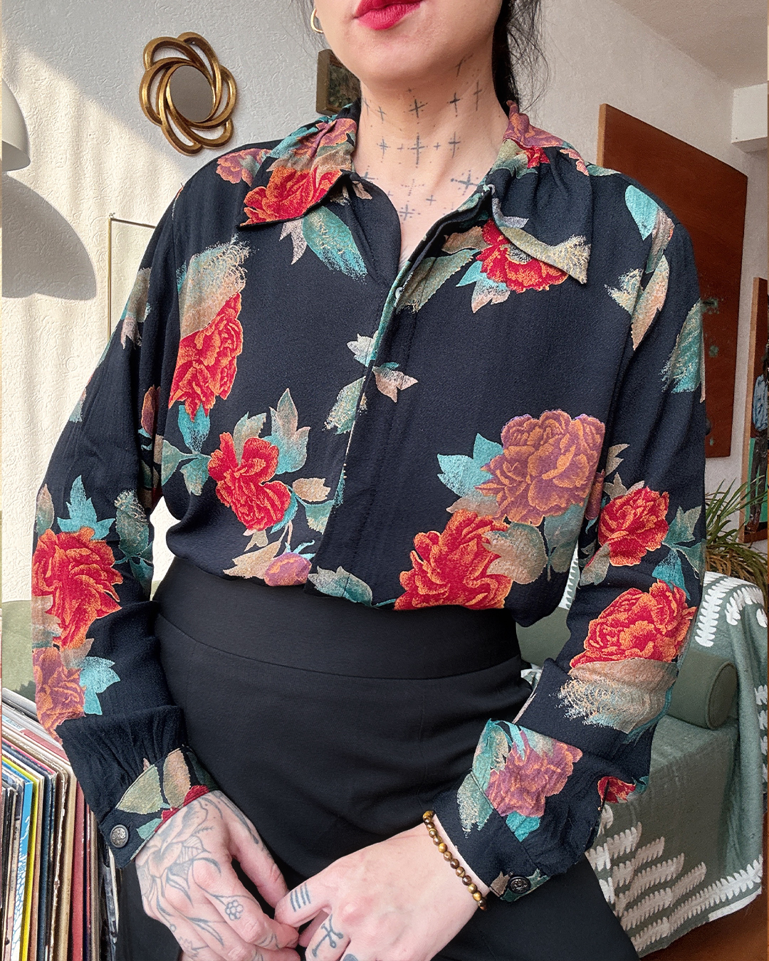 Blusa de manga larga con print floral en tonos cálidos sobre fondo negro. 100% rayón crepé, o sea mega suave de usar.