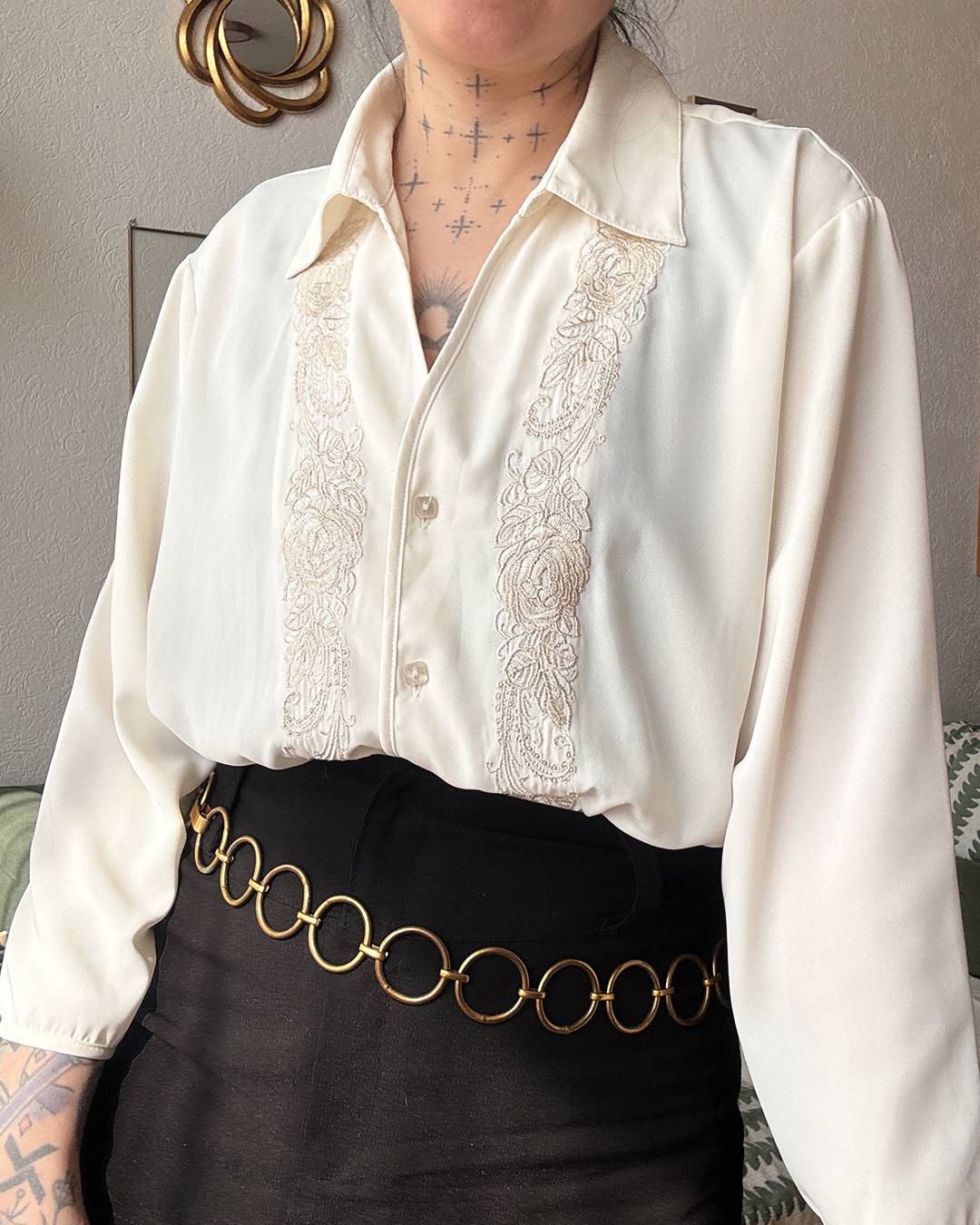 Blusa vintage en tono crema con bordados florales cuidadosamente trabajados al frente. Tela suave, corte clásico y botones perlados.
