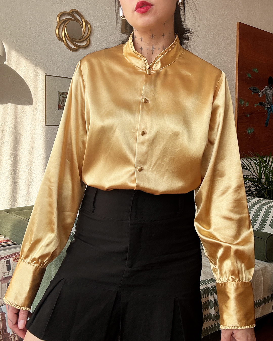 Blusa satinada en tono dorado suave, manga larga y cuello mao con botones forrados.