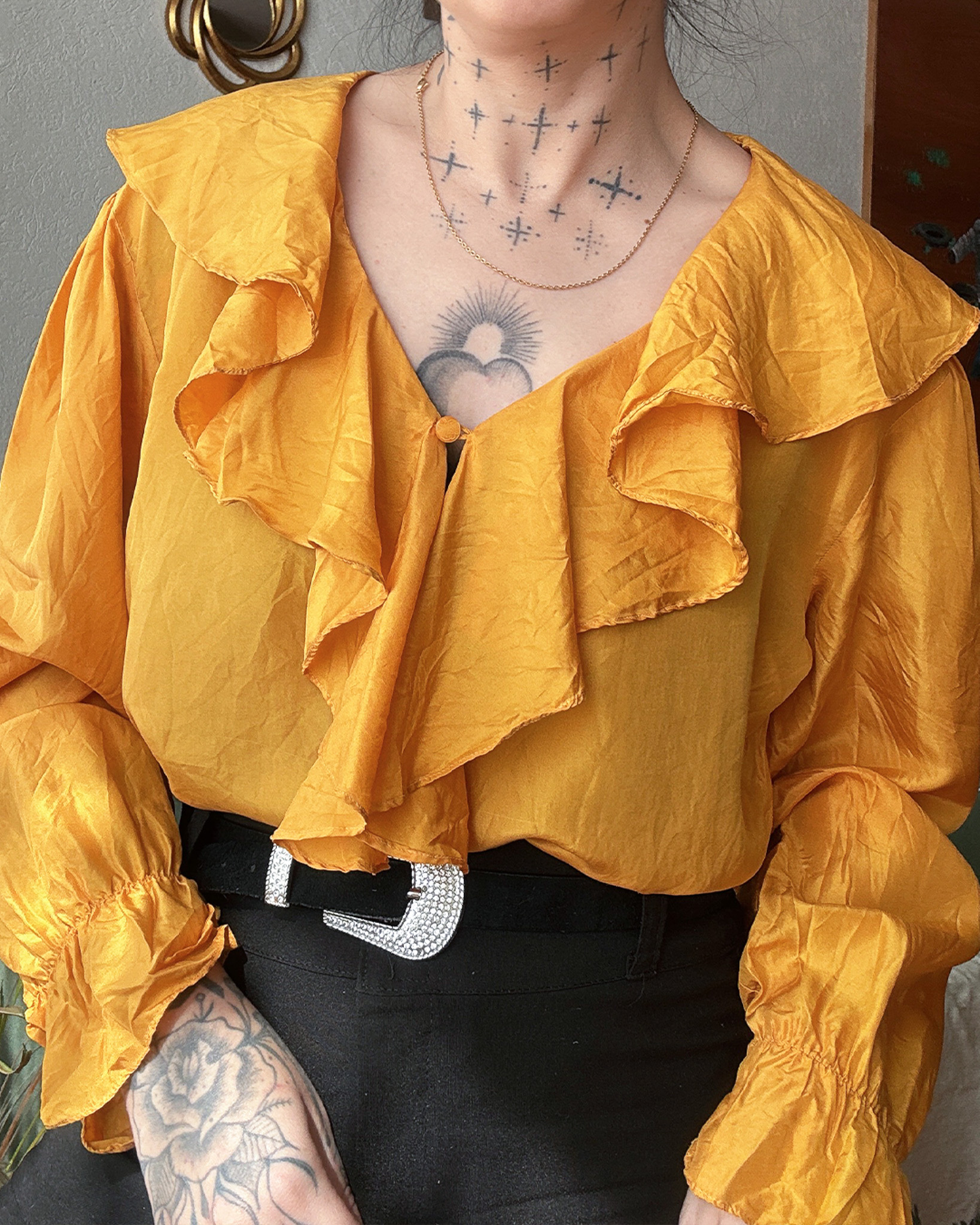 Bonita blusa hecha de seda con cuello marinero pero onduladito, tiene un botón pequeño en medio y mangas abullonadas.