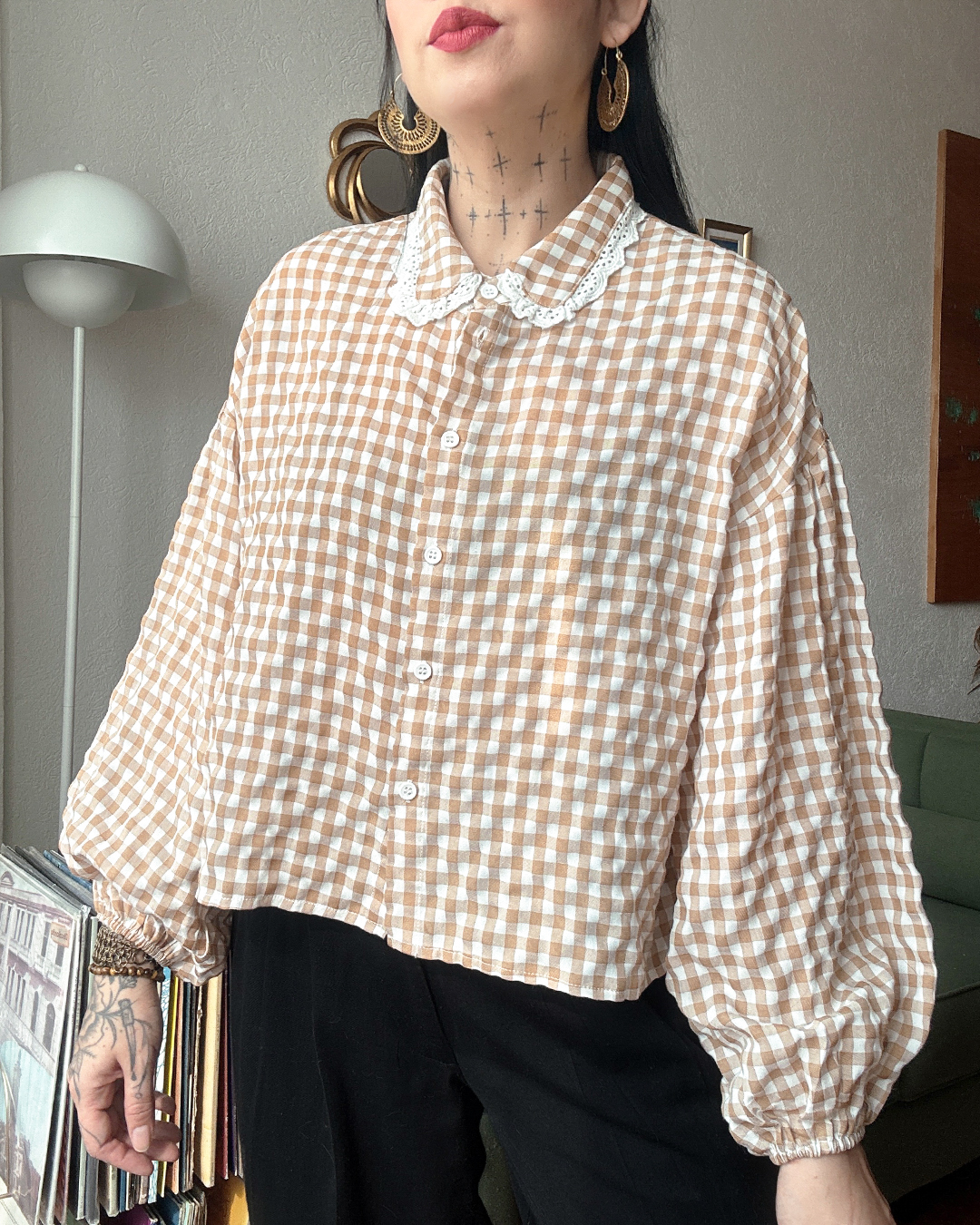 Blusa de cuadros vichy en tonos café y beige, con cuello decorado con encaje blanco. Mangas largas con puño elástico.