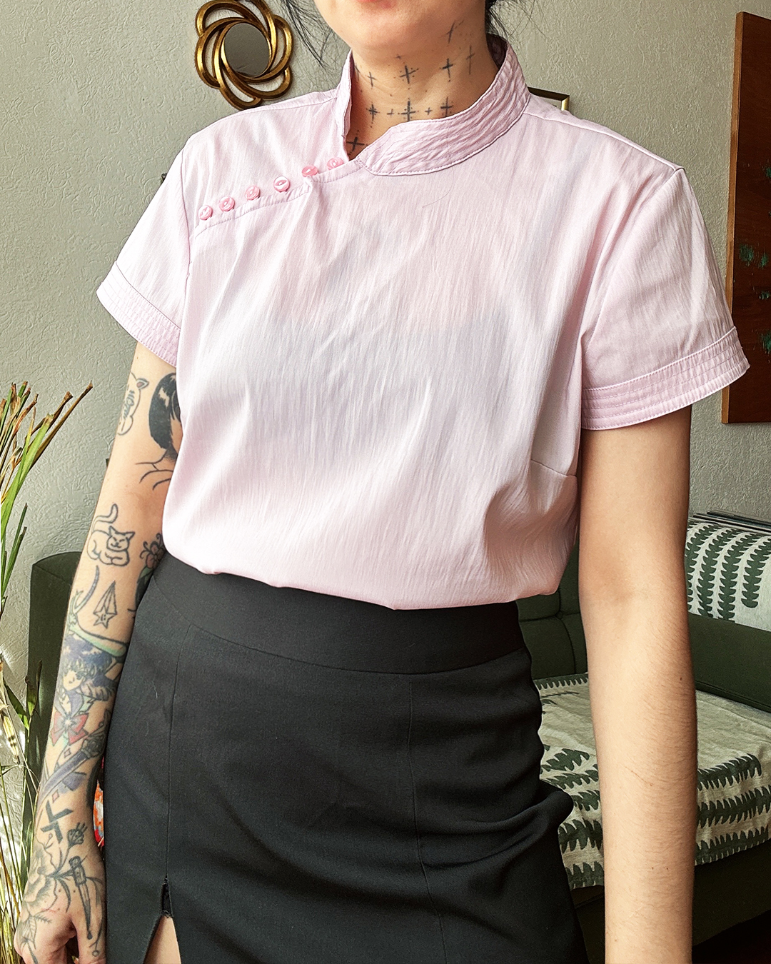 Camisa tipo cheongsam en tono rosa pálido con cierre asimétrico y botones brillantes. Inspiración oriental, delicada y minimalista.