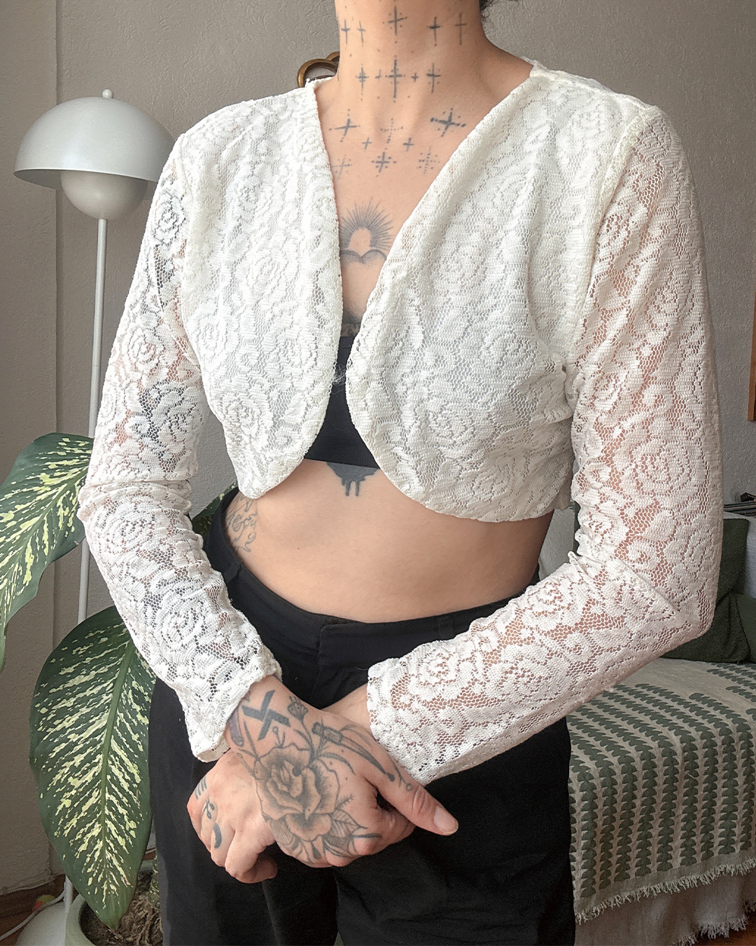 Delicado bolero cropped de encaje floral en color blanco perla.