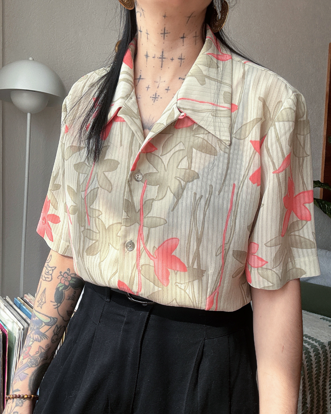 Blusa ligera con fondo claro y flores suaves en tonos coral y beige.