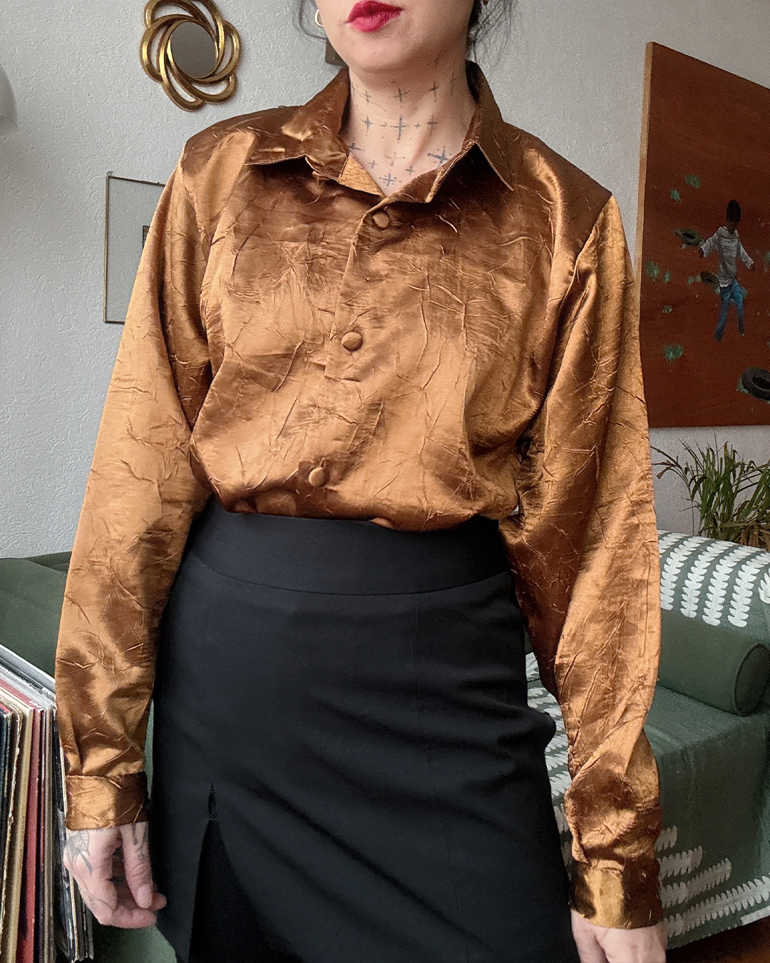 Camisa vintage de acabado satinado en tono cobre/dorado con textura ligeramente arrugada que refleja la luz de forma súper bella. Corte clásico, botones al frente y mangas largas.