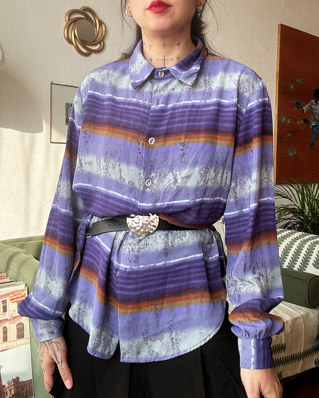 Blusa ligera con estampado de franjas en tonos morado, azul y café. Manga larga con puño y botones frontales en forma de cristales.