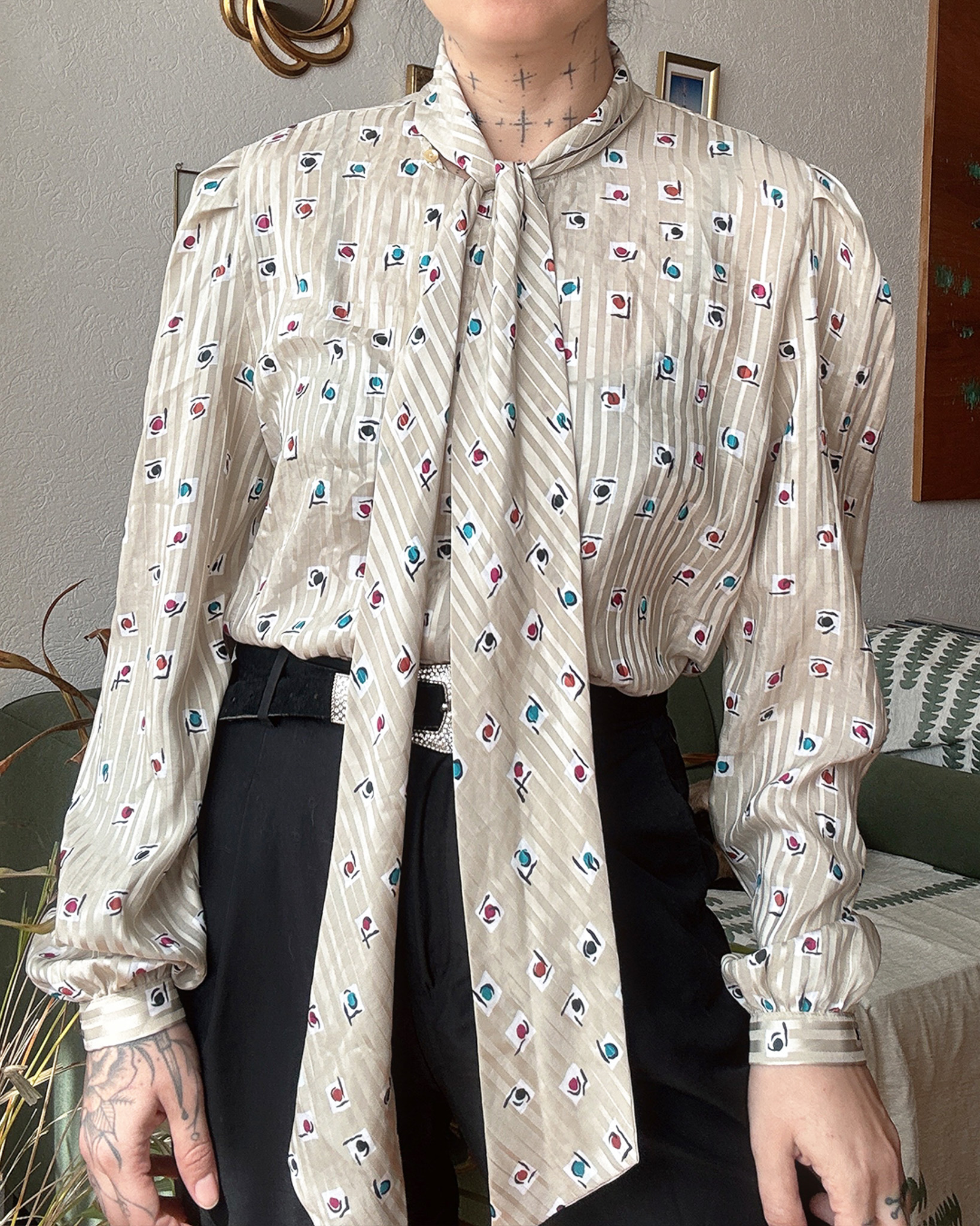 Blusa beige con estampado geométrico en tonos azul, vino y negro. Cuenta con un lazo largo al cuello que puede anudarse o dejarse suelto.