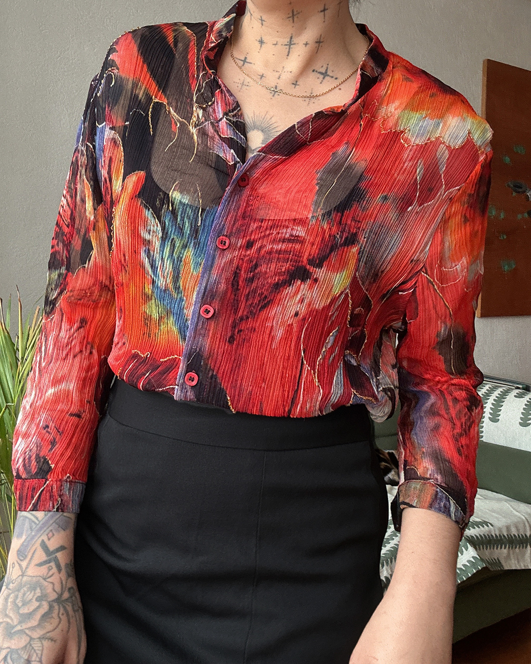 Camisa ligera con textura plisada y estampado tipo óleo en tonos rojos, azules y negros. Vibrante, artística, y con energía expresiva —como una pintura sobre tela.