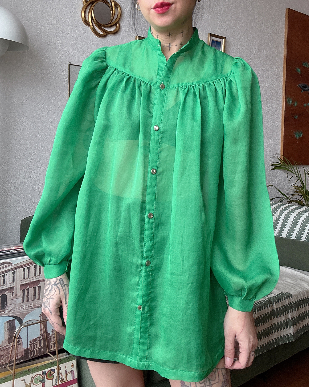 Camisa traslúcida en verde esmeralda intenso. Las mangas abombadas y el frunce en pecho la hacen súper femenina y delicada; una pieza que brilla por sí sola. También puedes usarlo con un mini vestido pero poniéndote algo abajo.