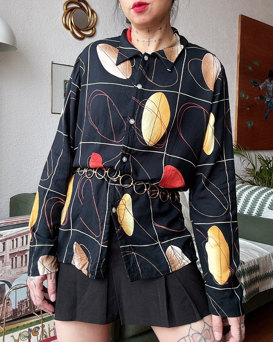 Camisa negra con estampado geométrico en tonos mostaza, beige y rojo. Con vibra retro y artística, tiene unos ligeros puntitos blancos al frente, precio especial