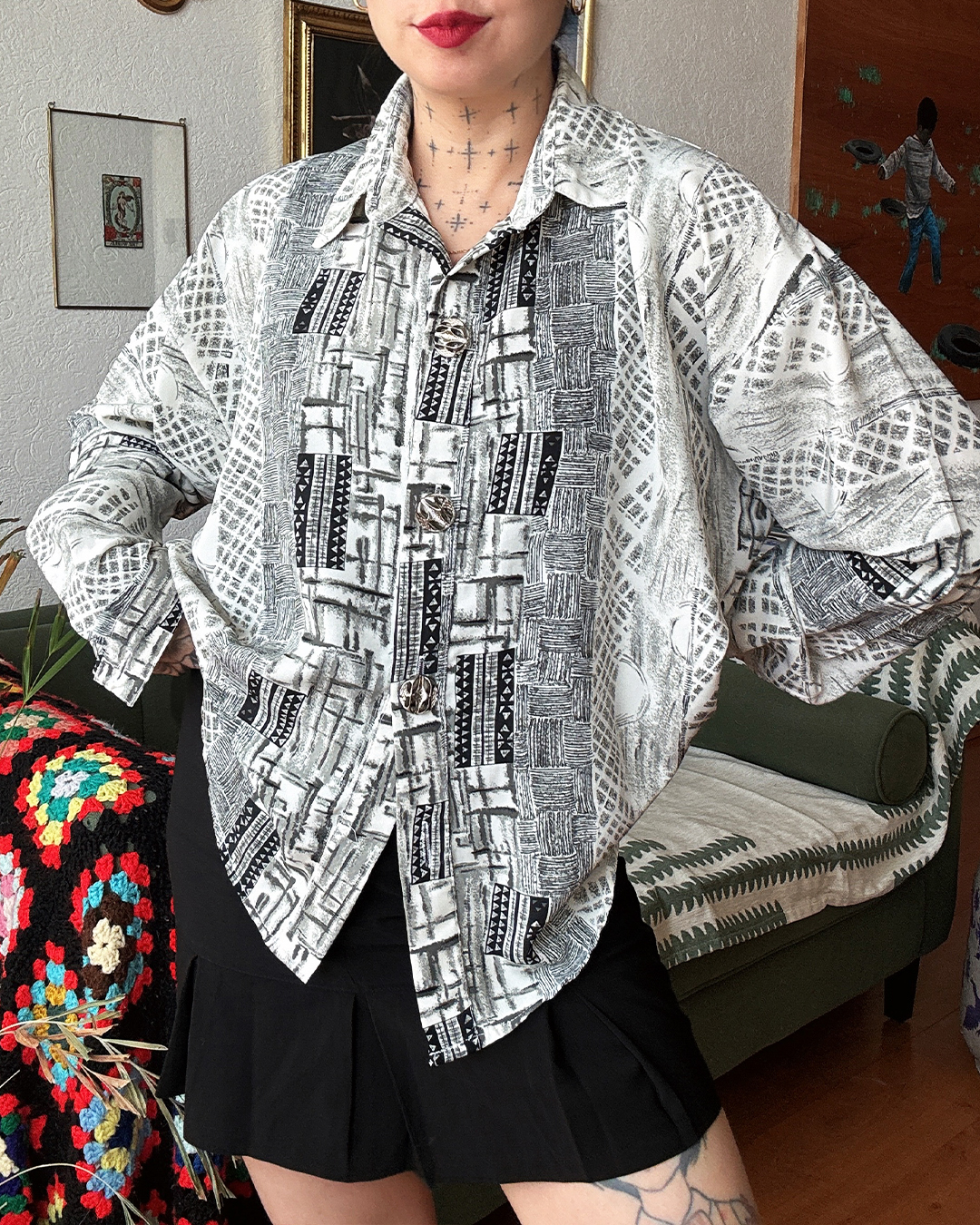 Camisa de corte amplio con estampado geométrico en negro, gris y blanco. Botones metálicos decorativos y caída fluida.