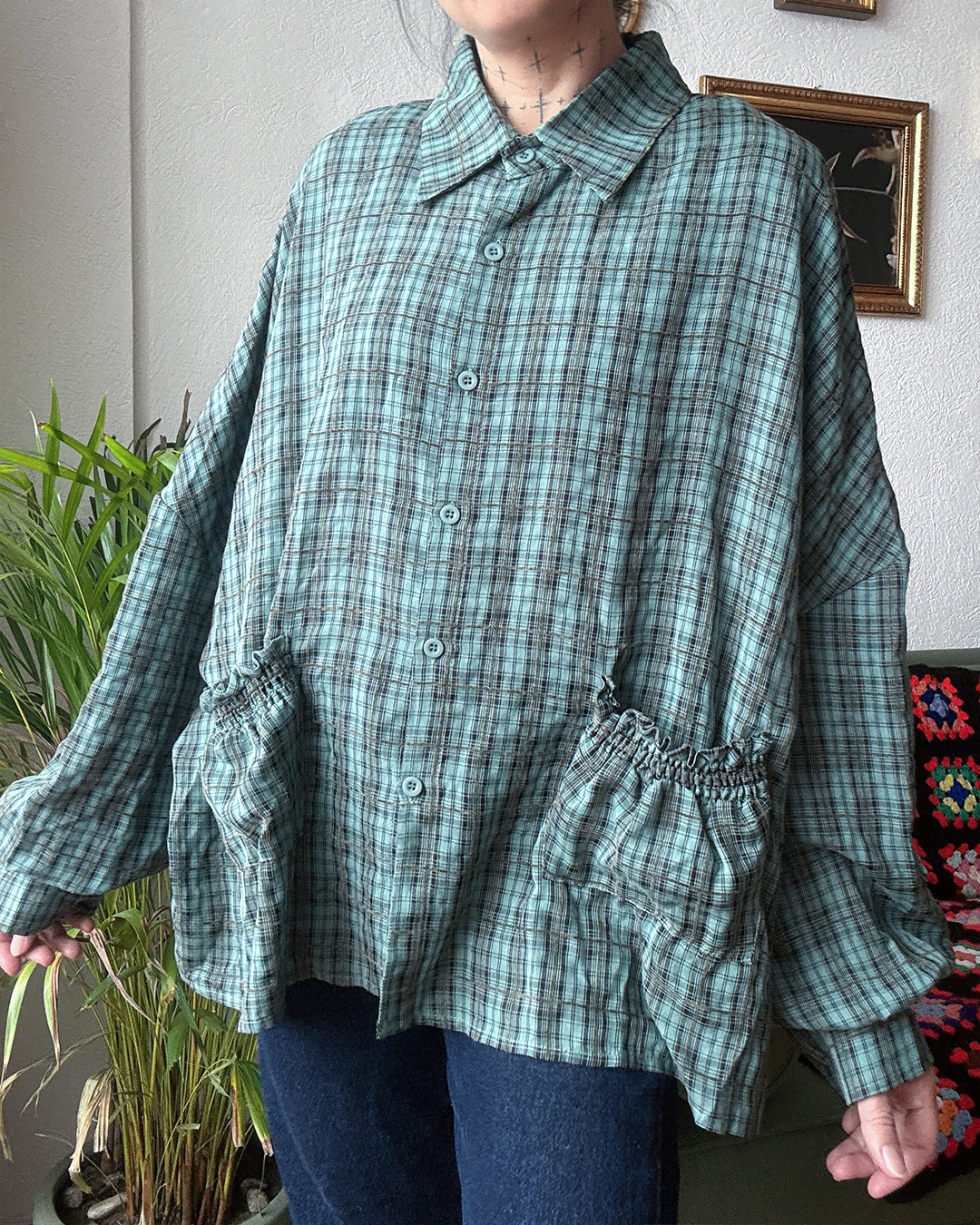 Camisa de manga larga con corte amplio estilo oversize. Tiene cuello camisero y botones frontales en el mismo tono de la tela. Dos bolsillos grandes con detalle fruncido en los costados, que le dan un aire práctico y original. Perfecta para usar como capa ligera o con estilo relajado.