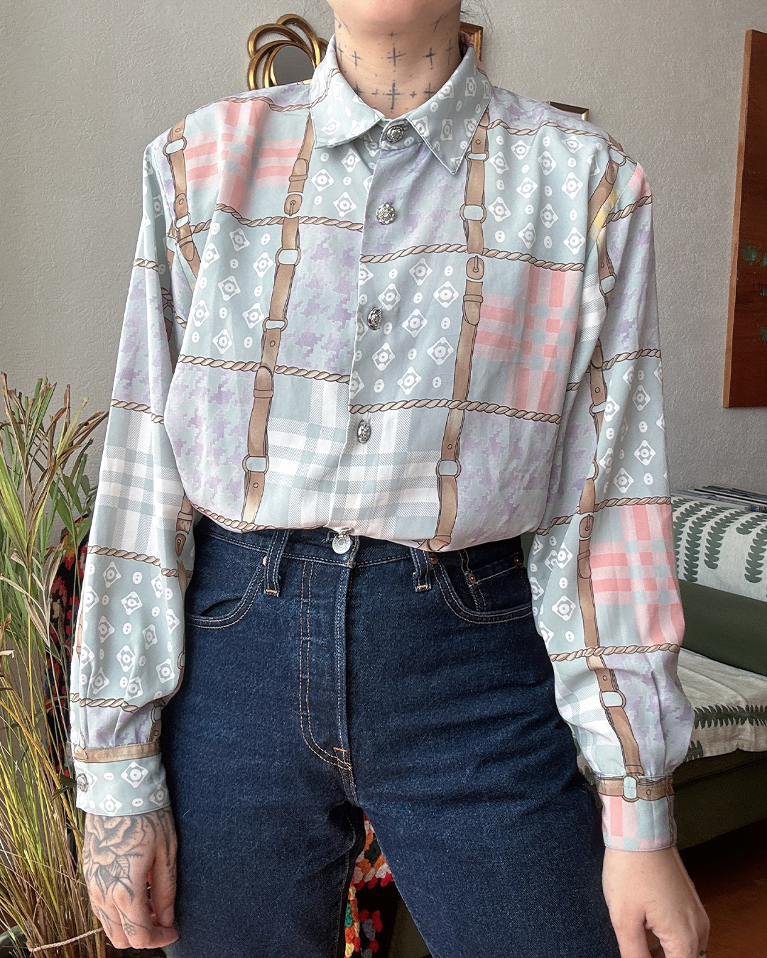 Camisa tipo seda con diseño de cuadros y correas en tonos pastel: menta, rosa, lavanda y beige. Botones metálicos plateados, corte recto y puños anchos.