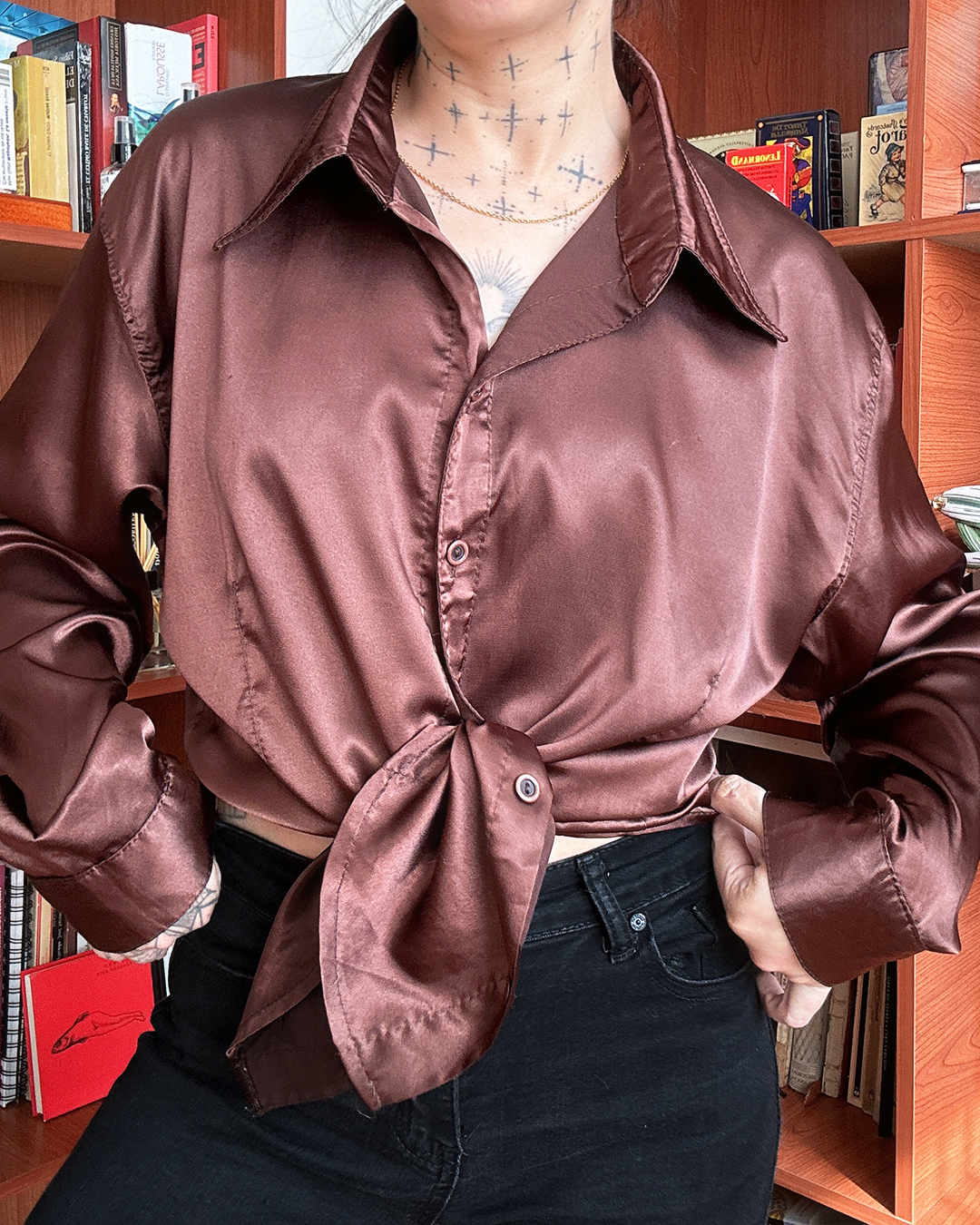 Camisa de manga larga en satín color café chocolate, con brillo sutil.