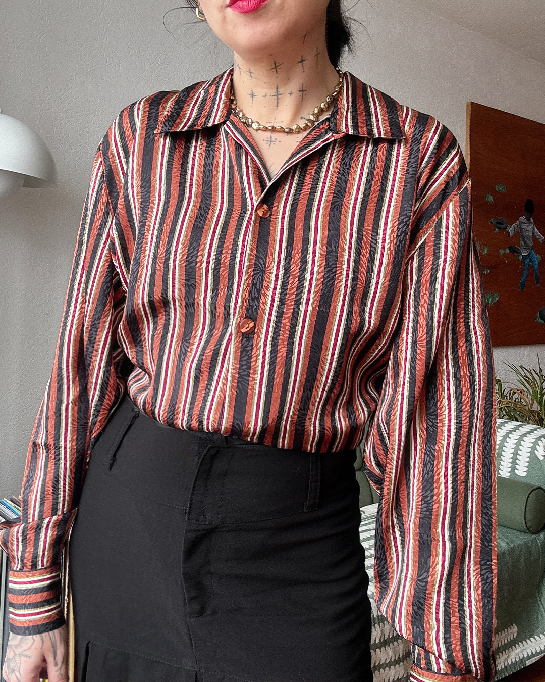Blusa ligera con estampado de rayas en tonos tierra, vino y crema. Tiene una textura además súper bonita.