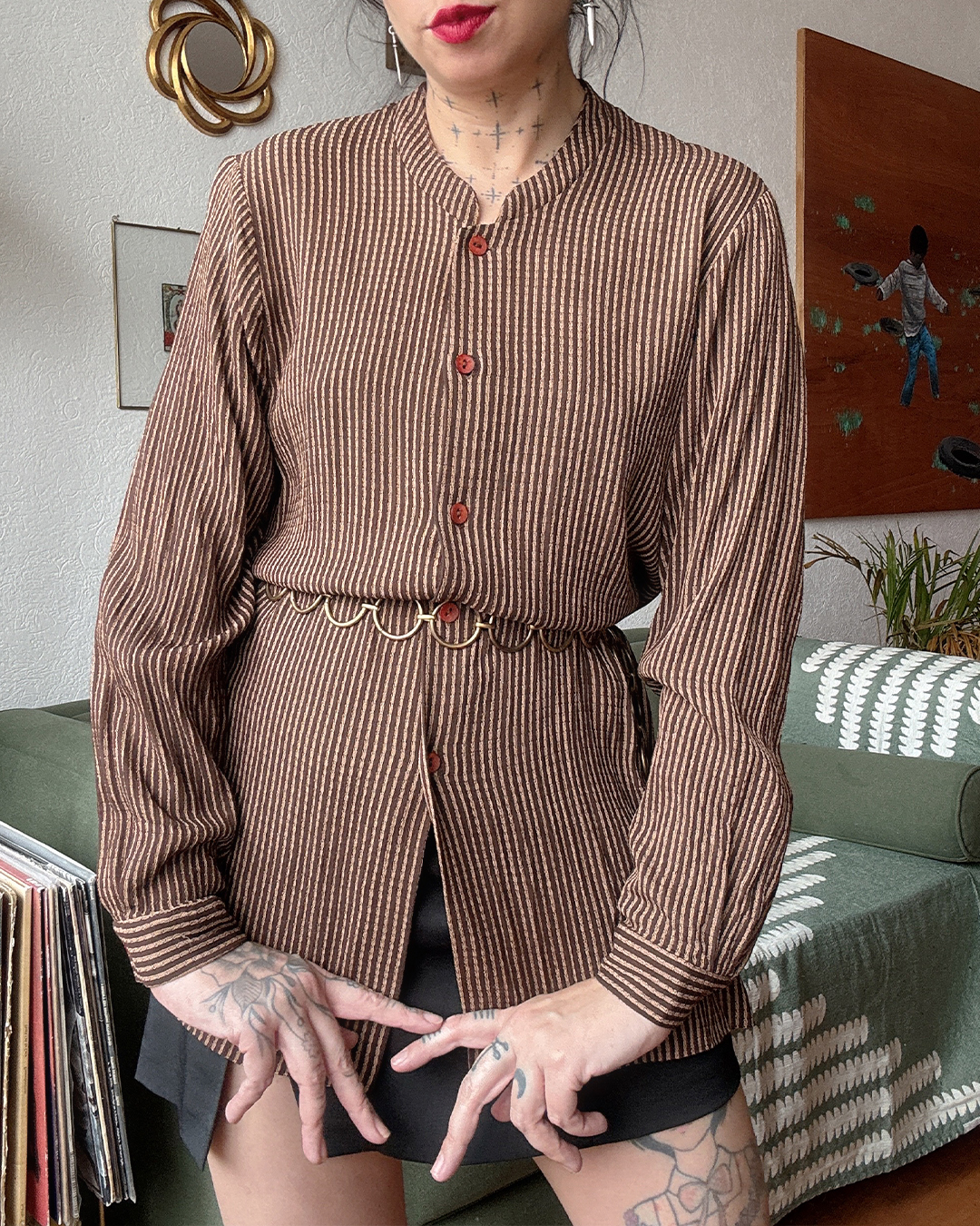 Camisa vintage en tonos café con rayas verticales que estilizan visualmente.