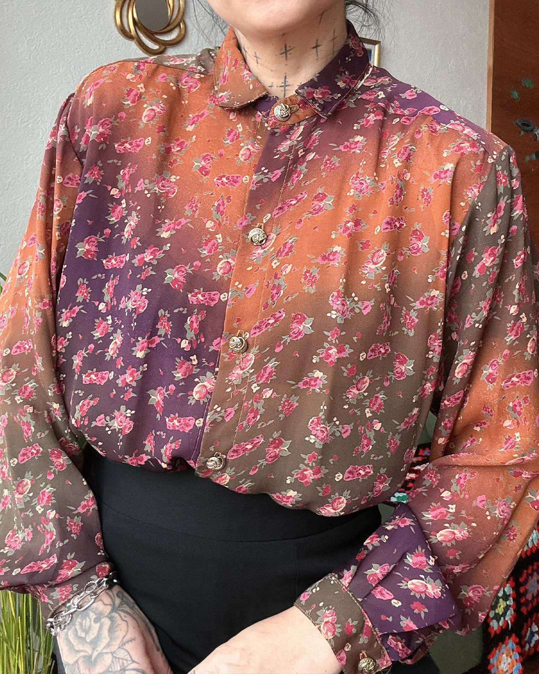 Blusa vintage de manga larga con estampado floral en tonos rosas sobre base degradada en morado, naranja y verde olivo. Cuello camisero y botones metálicos decorativos. Muy femenina, con aire bohemio y único.
