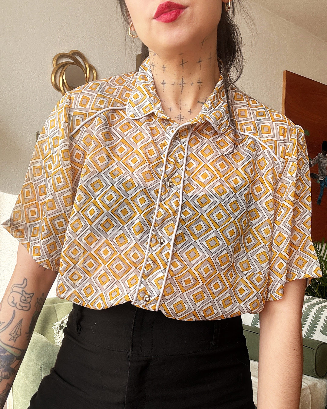 Blusa ligera con estampado geométrico en tonos mostaza y blanco. Corte recto, manga corta amplia y botones al frente.