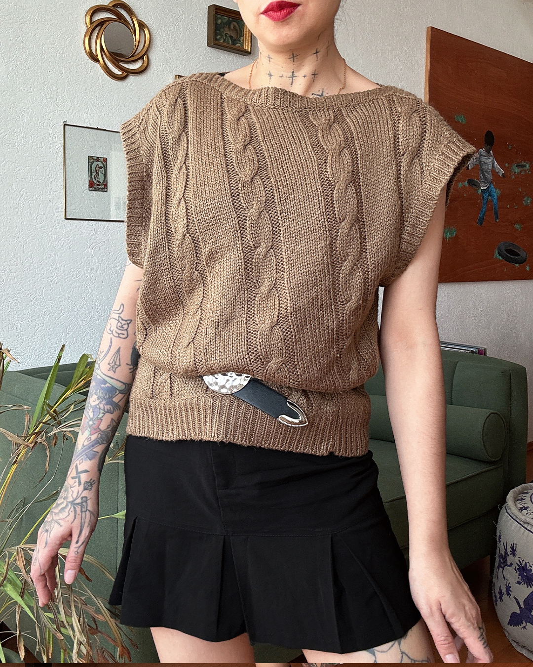 Chaleco de punto grueso con trenzas frontales y hombro caído. Cuello redondo y ajuste relajado.