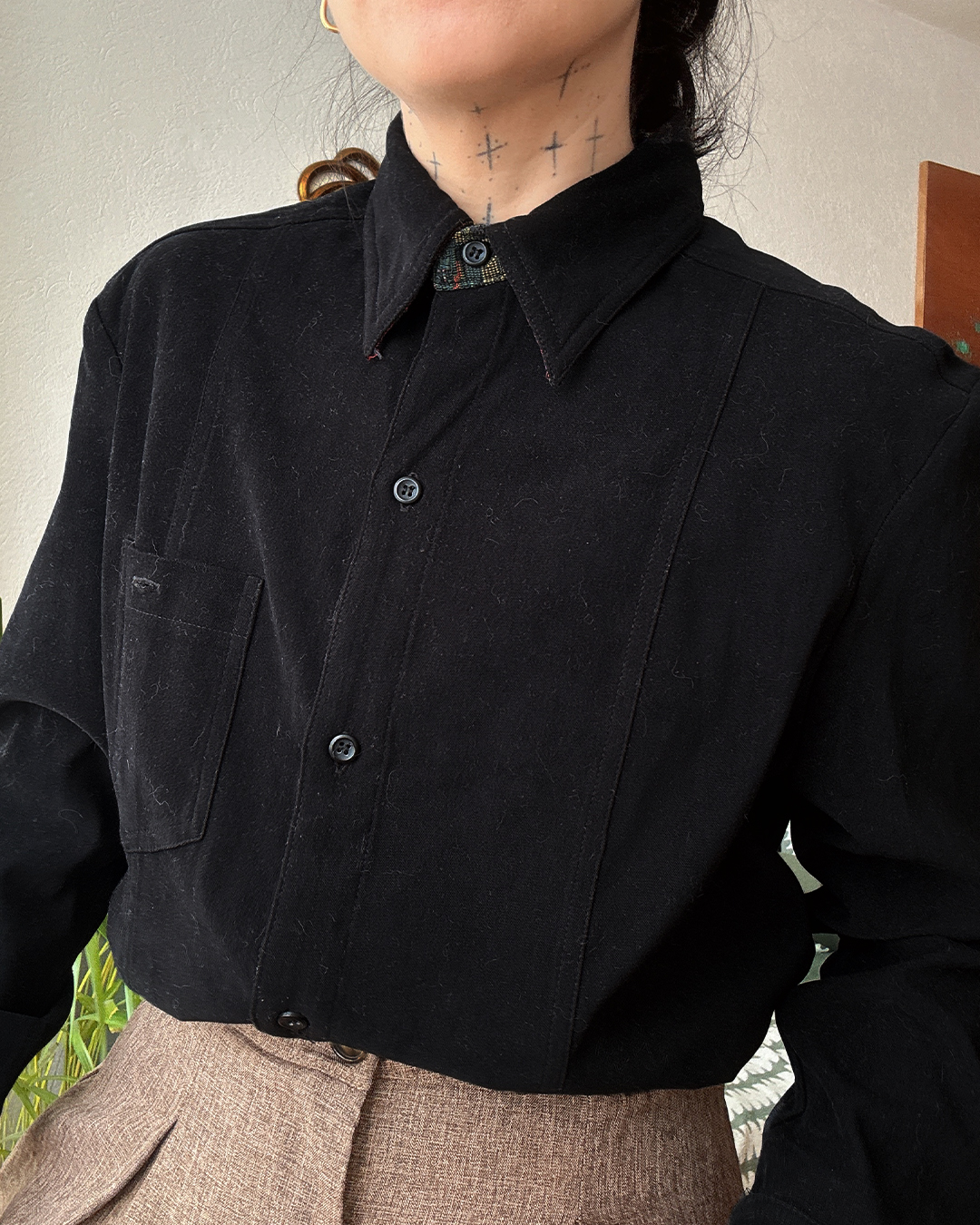 Camisa vintage negra de manga larga, con bolsillo en el pecho y cuello camisero. Corte recto y botones frontales. Textura de pana.