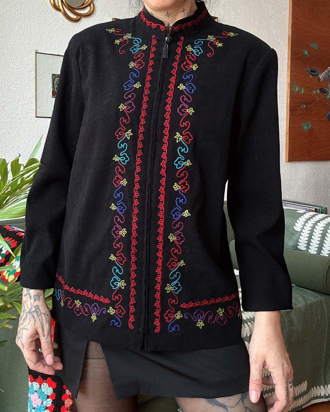 Saquito vintage negro con bordados en hilos de colores (rojo, azul, amarillo, verde) en el frente y mangas. Cierre de cremallera al frente y cuello mao.