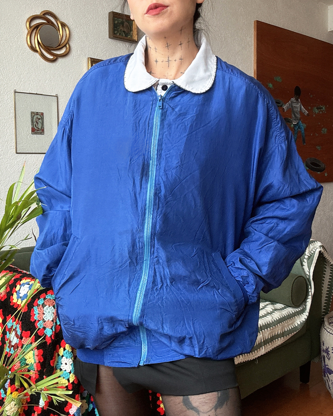 Chamarra ligera tipo rompevientos en color azul eléctrico, con cierre frontal, bolsillos laterales y cuello blanco. Estilo ochentero, amplio y casual. 100% seda.