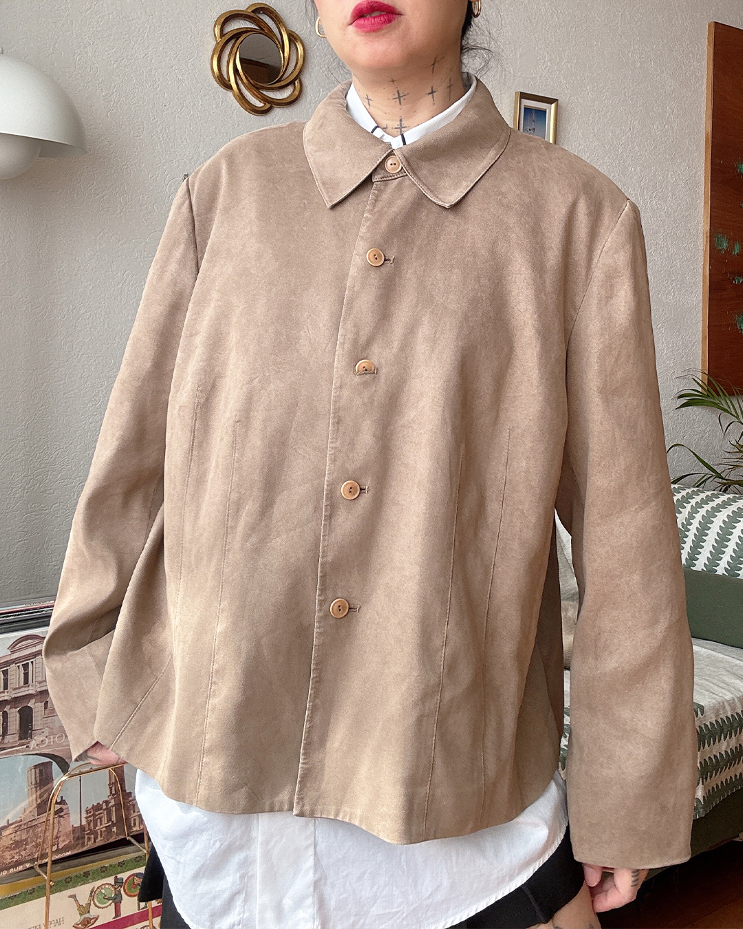 Chaqueta tipo suede en tono arena, suave y ligera. Tiene caída recta y botones al frente, perfecta para looks minimalistas y combinable con todo.