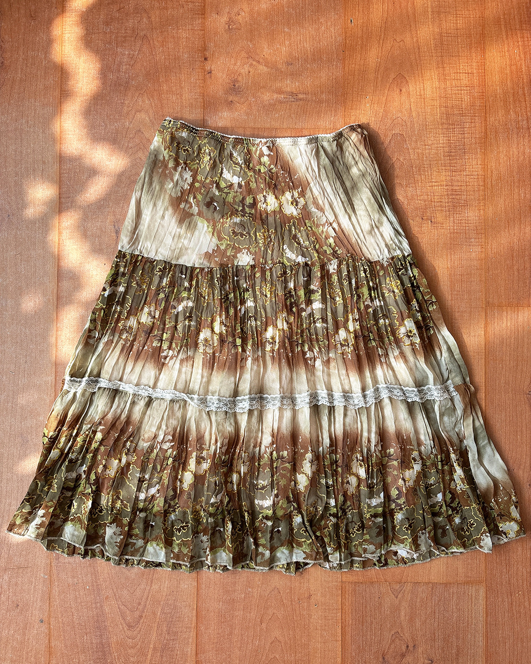 Falda midi en gasa plisada, con estampado floral en tonos verdes, beige y marrón. Tiene detalle de encaje blanco en el corte horizontal.