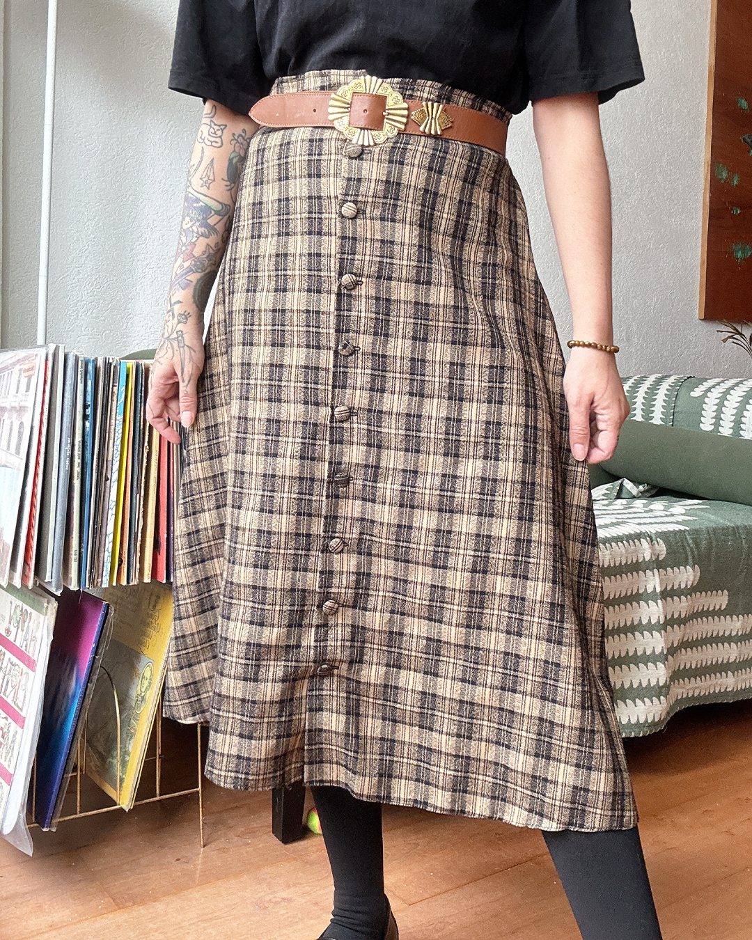 Falda midi de tiro alto con botones frontales y estampado a cuadros en tonos café y beige. Muy preppy.
