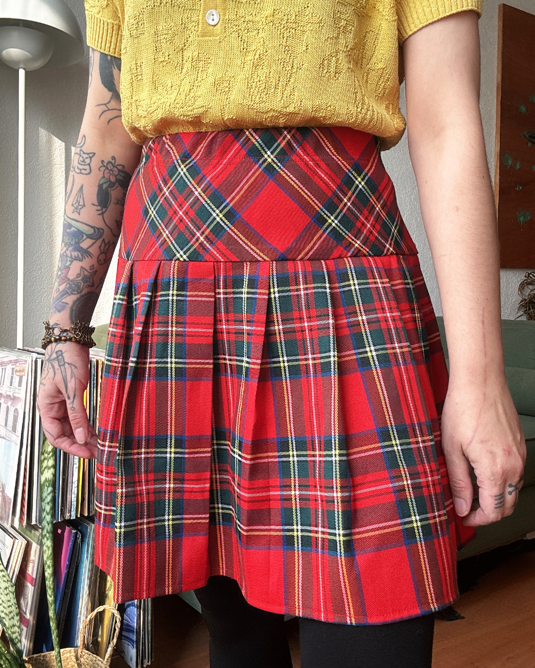 Falda corta con plisado clásico en tartán rojo. Vibra preppy y punk suave.