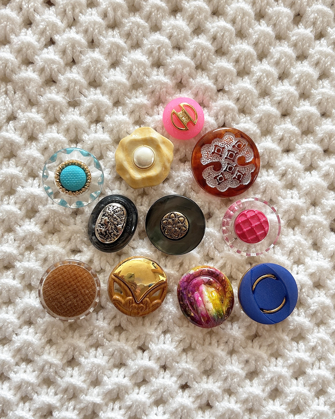 Set de 10 botones vintage en colores vibrantes y formas variadas. Cada pieza es distinta: tonos saturados, pasteles, texturas lisas o con relieve.