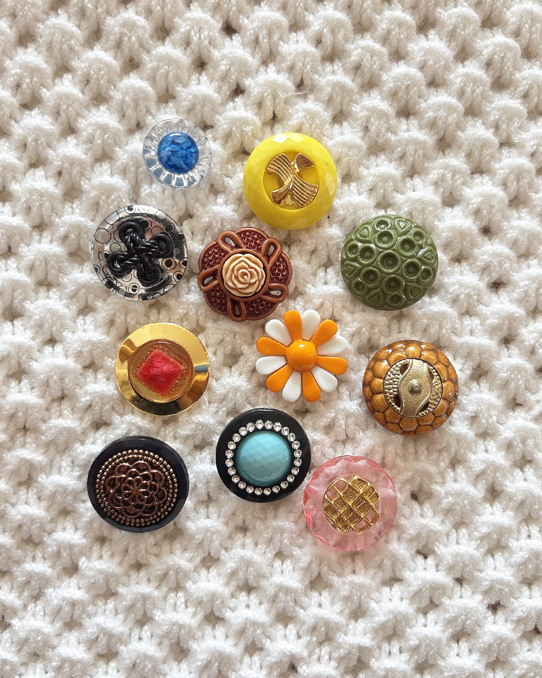 Set de 10 botones vintage en colores vibrantes y formas variadas. Cada pieza es distinta: tonos saturados, pasteles, texturas lisas o con relieve.