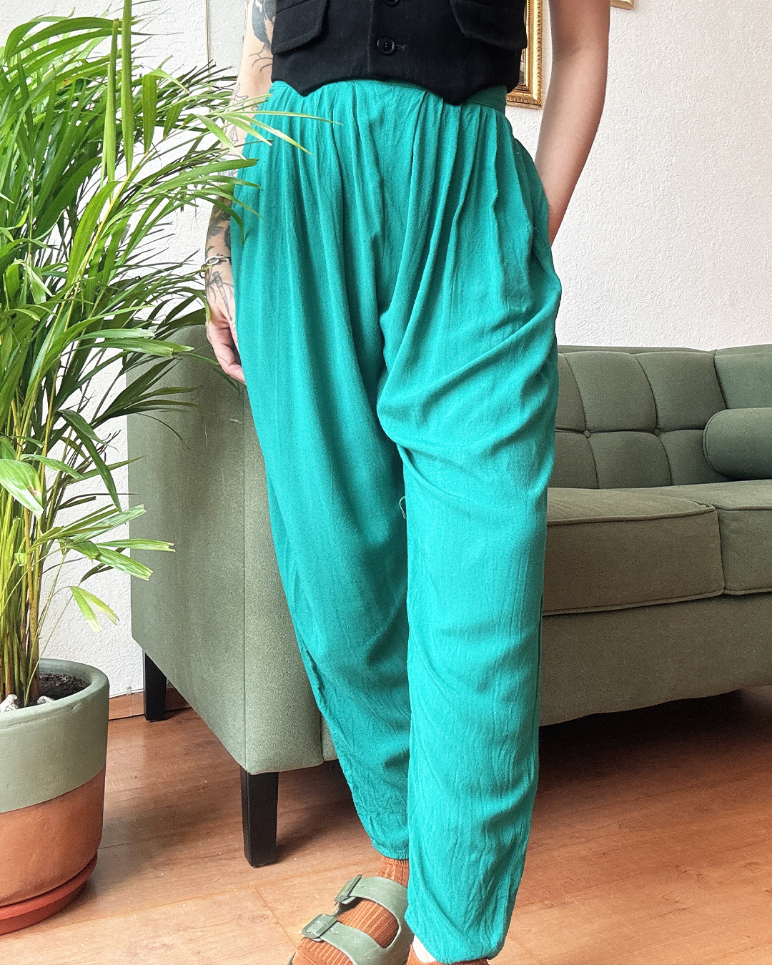 Pantalón vintage de rayón en color menta. Es súper cómodo y suave. Tiene corte bombacho, cierre lateral y bolsillos al frente.