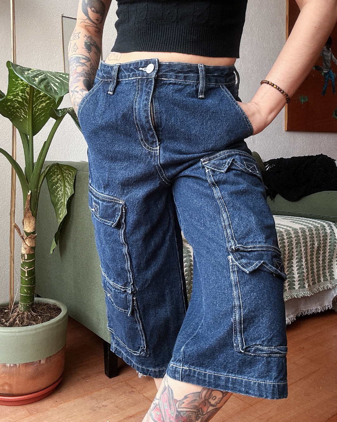 Shorts largos tipo bermuda en mezclilla azul oscuro con costuras blancas en contraste. Tiene varios bolsillos tipo cargo a los lados.