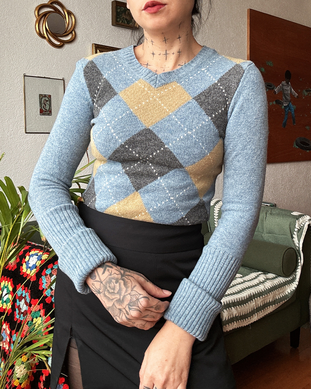Suéter de punto con patrón argyle en tonos azul cielo, gris y mostaza. Cuello en V y puños anchos acanalados. Estilo preppy clásico. 100% lana.