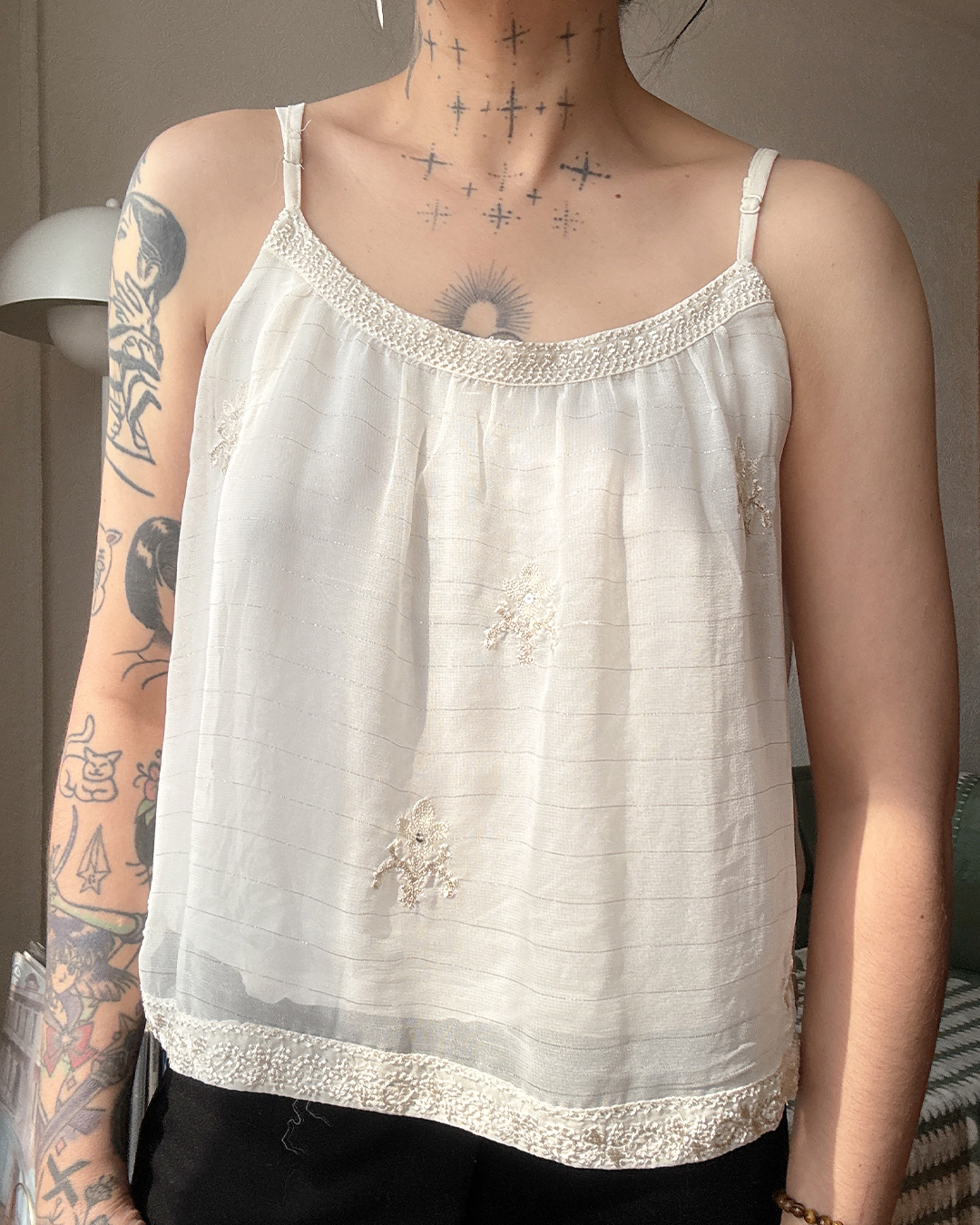 Top aperlado de tirantes, con bordados sutiles y textura ligera.