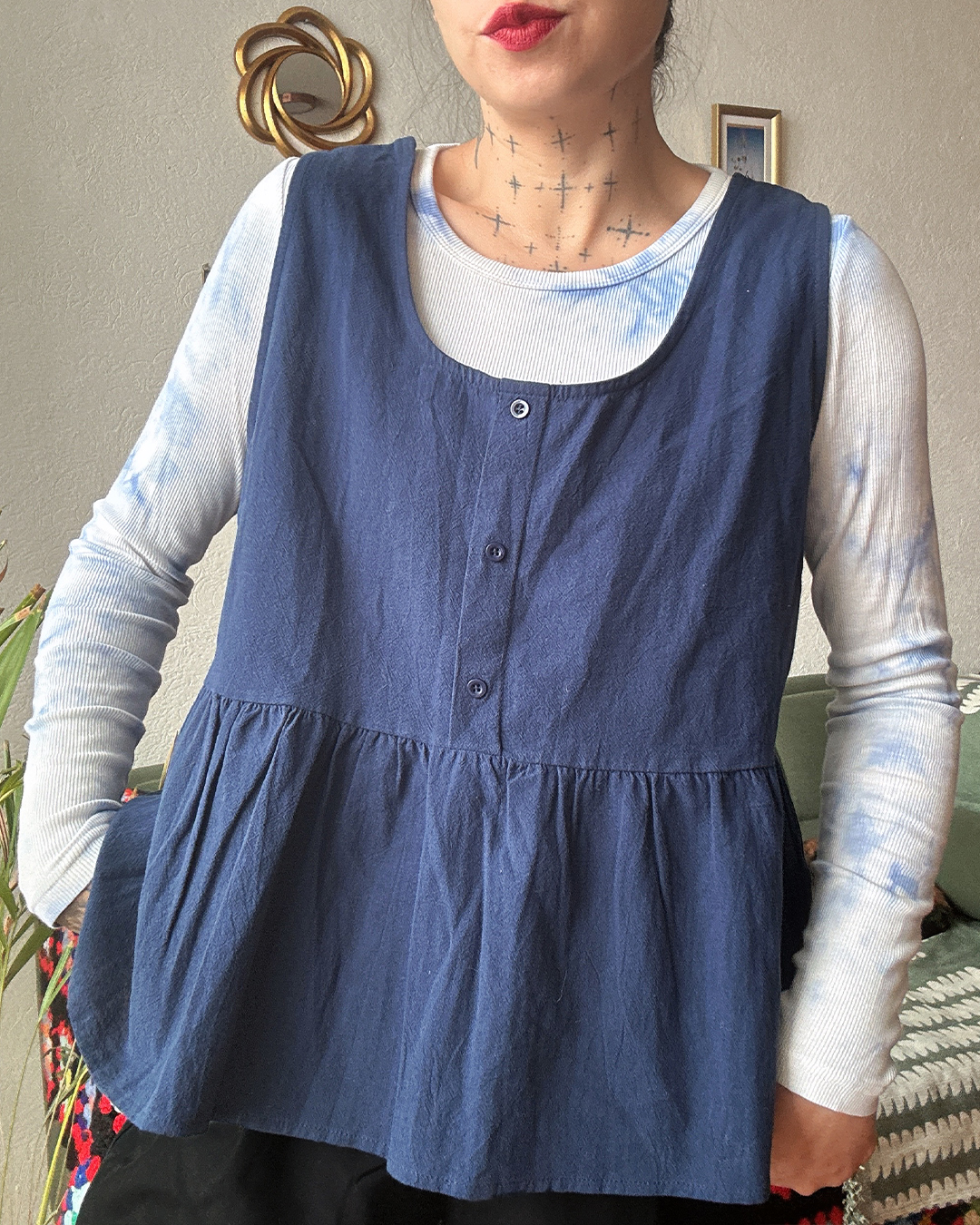 Top sin mangas en tono azul marino con corte tipo babydoll y botones al frente.