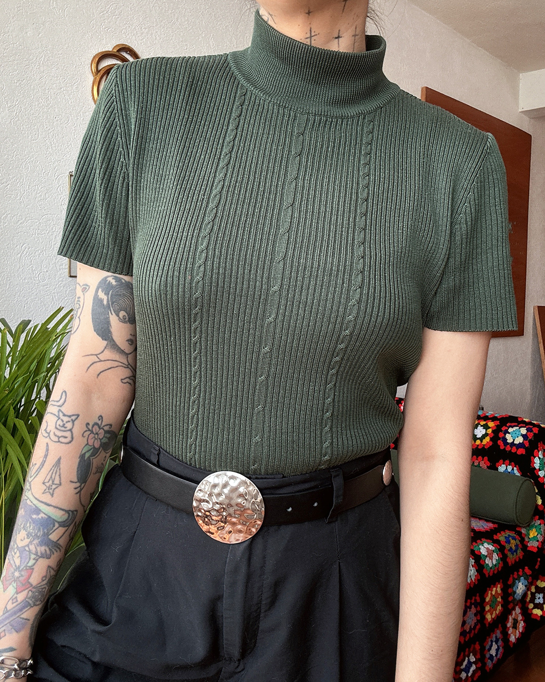 Blusa de punto vintage en color verde bosque, con cuello semi alto, manga corta y detalle de trenzado vertical en el tejido. Ajustada y cómoda, ideal para combinar con pantalones de tiro alto.