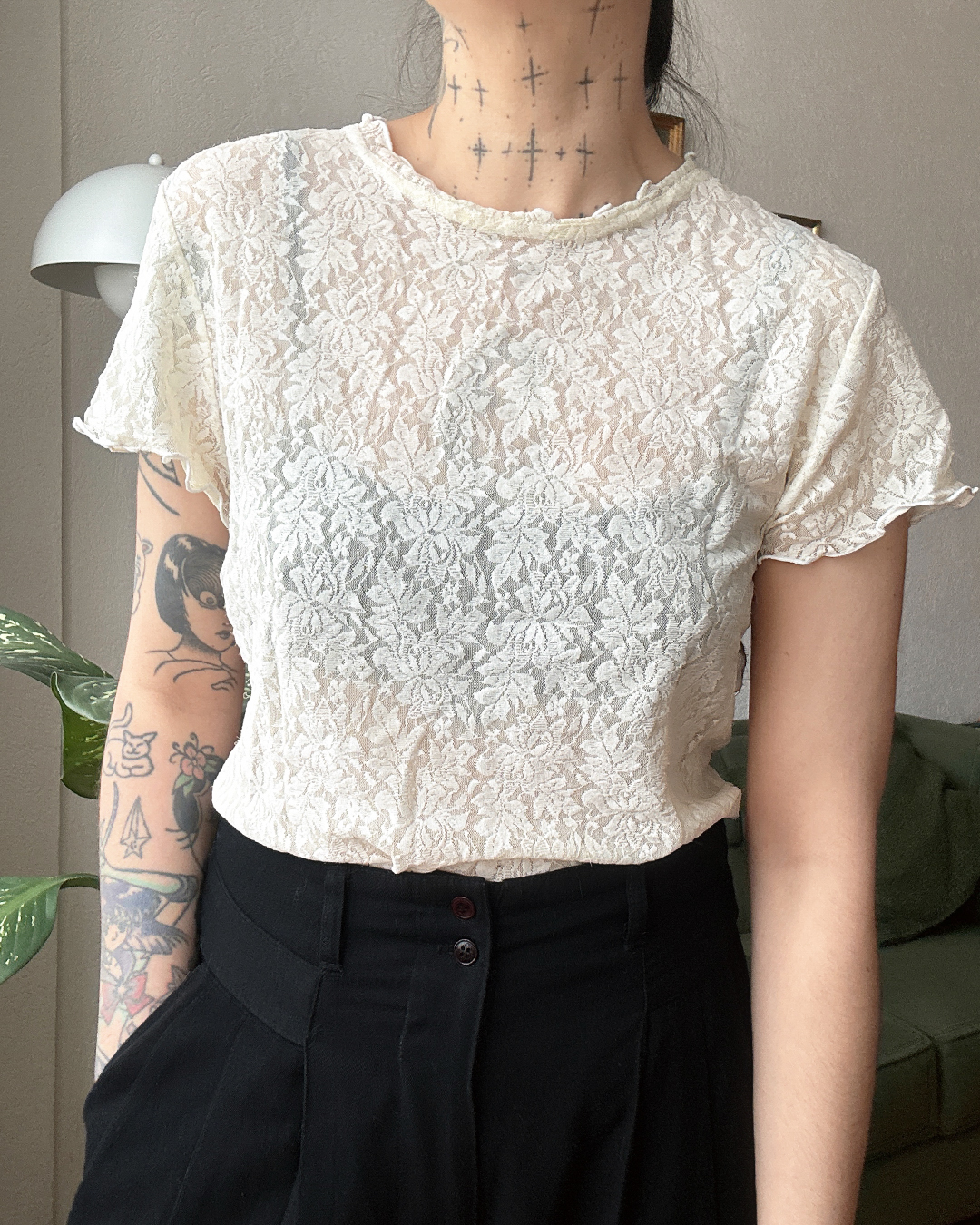 Top de manga corta en encaje con patrón floral clásico. Lindo cuello redondo y bordes ondulados (wavy trim) en mangas.