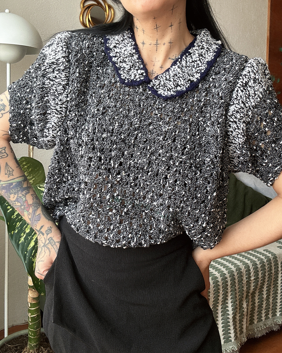 Blusa de punto calado en mezcla de blanco y negro (efecto sal pimienta).