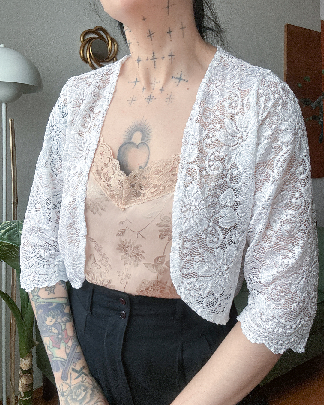 Torera o cárdigan corto de manga tres cuartos confeccionado íntegramente en encaje floral blanco.