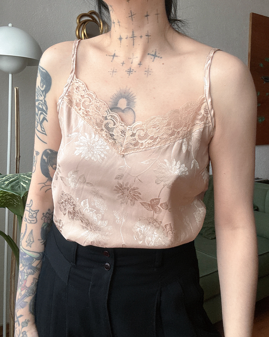 Top de tirantes finos en tono rosa empolvado con un sutil patrón floral satinado.