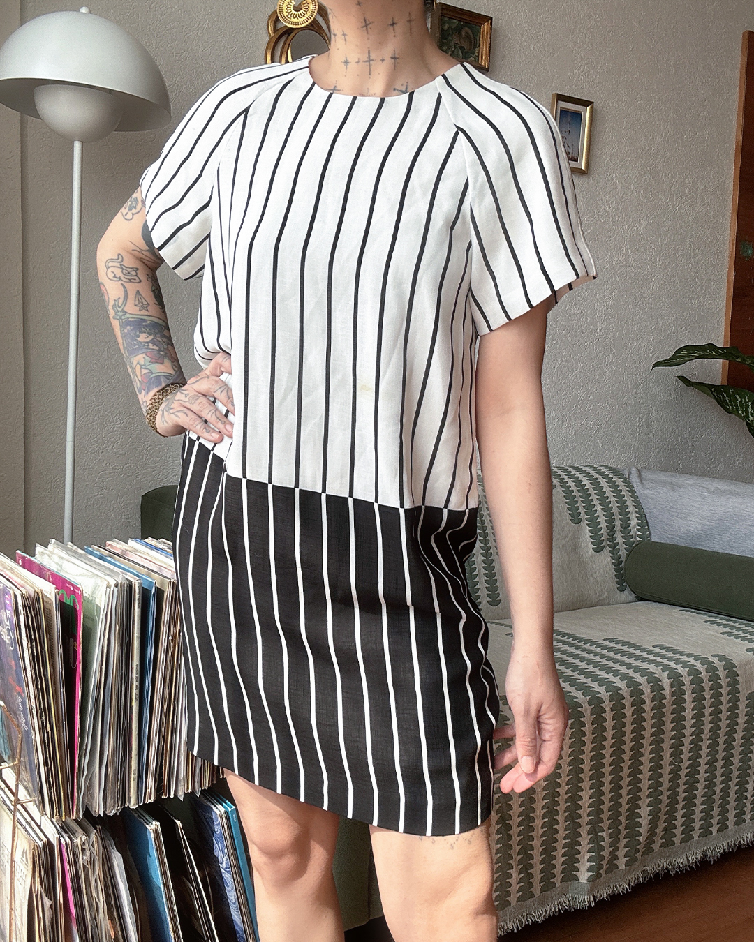 Vestido corto de líneas verticales en blanco y negro con diseño bicolor que alarga visualmente la silueta. Corte recto y cómodo, perfecto para usar solo o en capas.
