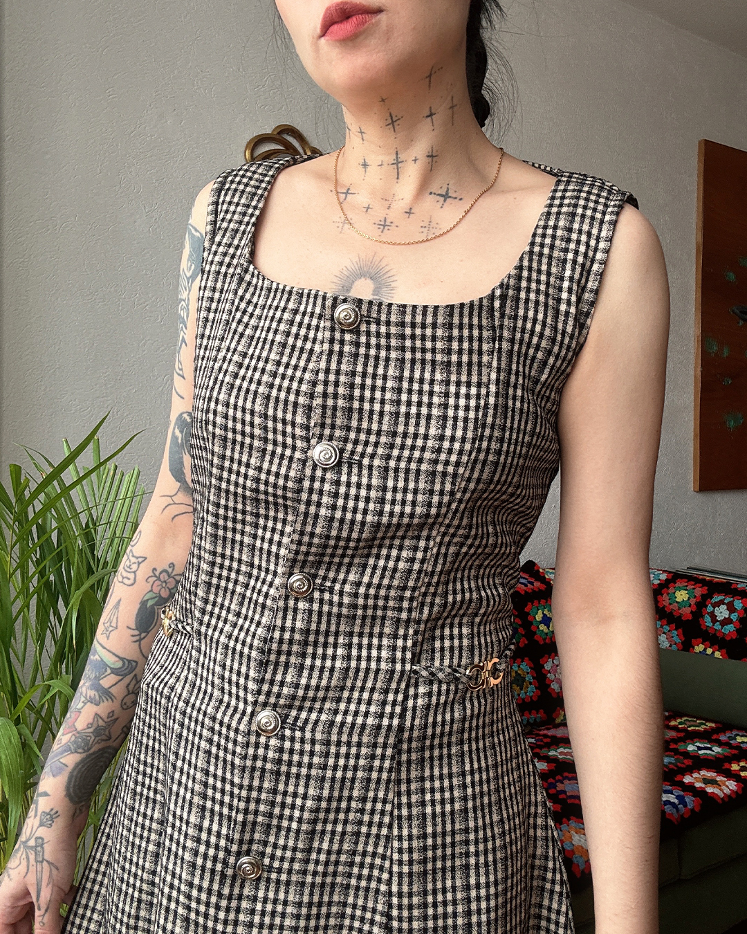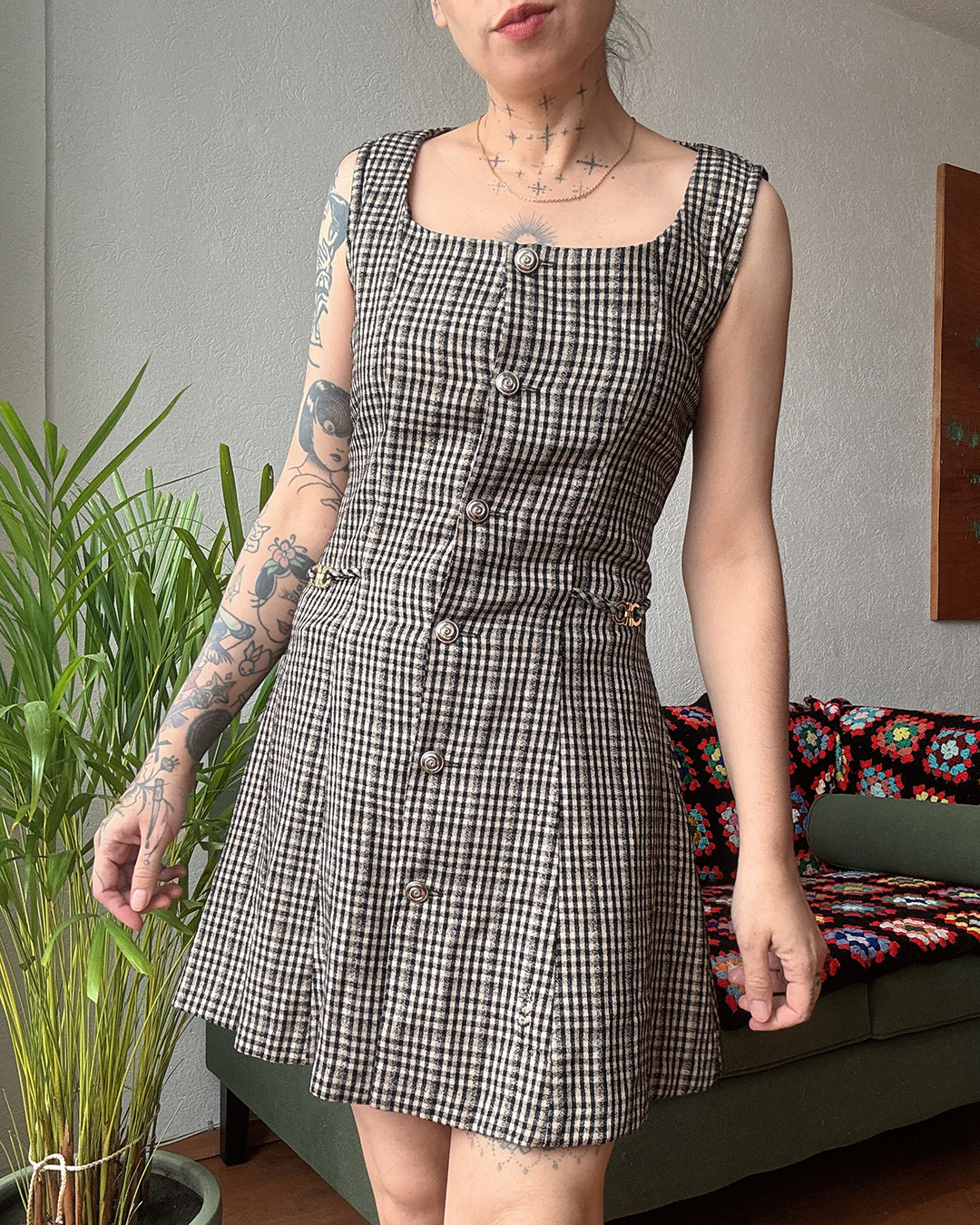 Vestido vintage de tirantes anchos con botones al frente. Estampado de cuadros en tonos marrón y beige. Corte entallado en la cintura y falda con ligero vuelo, muy noventero. Me encantan los broches que tiene a lo alto de la cintura, no son ajustables.