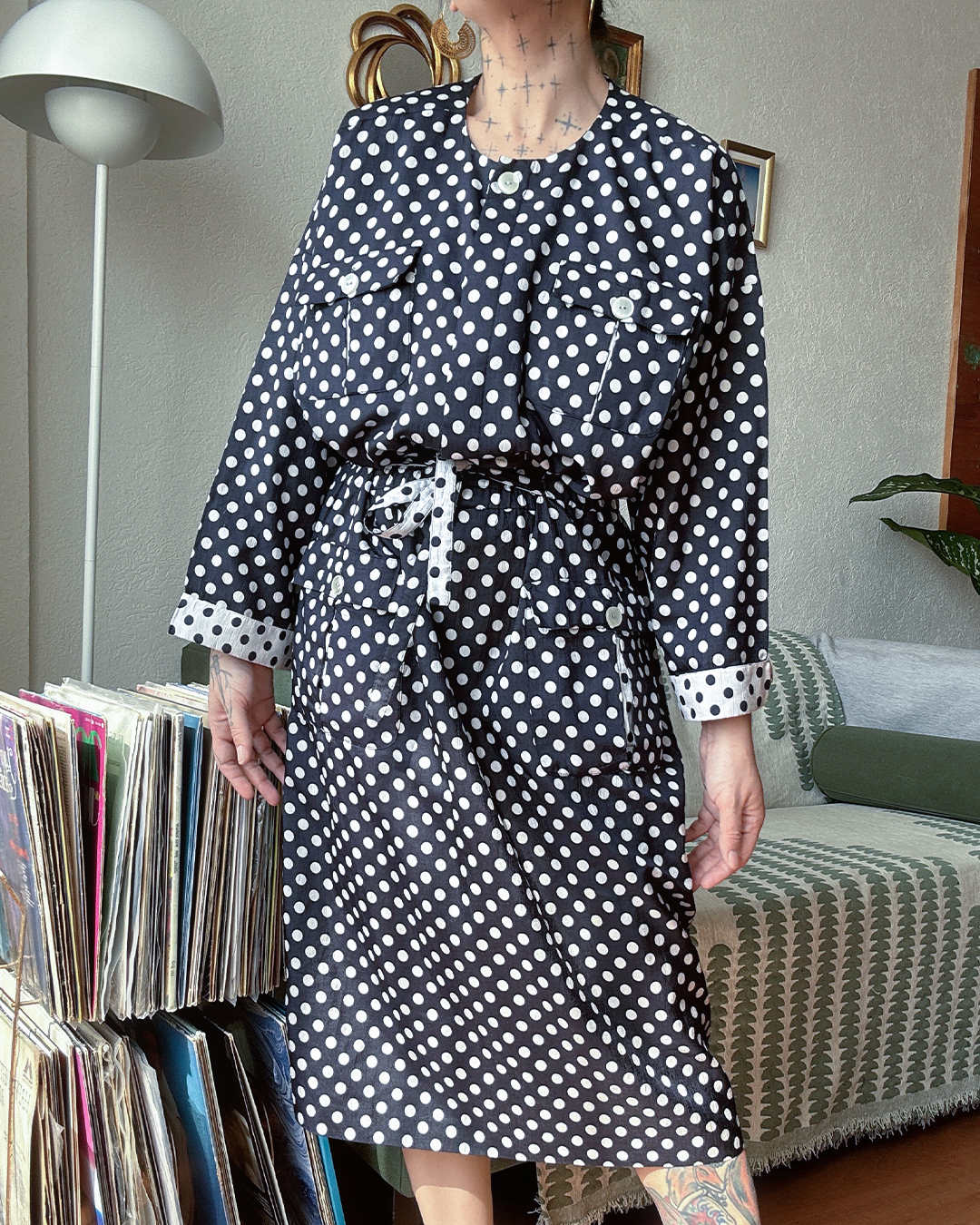 Vestido midi de lunares blanco y negro, con silueta relajada y cintura ajustable con lazo. Tiene bolsillos al frente y mangas largas con vuelta en contraste. Atemporal, cómodo y con ese aire francés effortless que funciona igual para diario que para algo más arreglado.