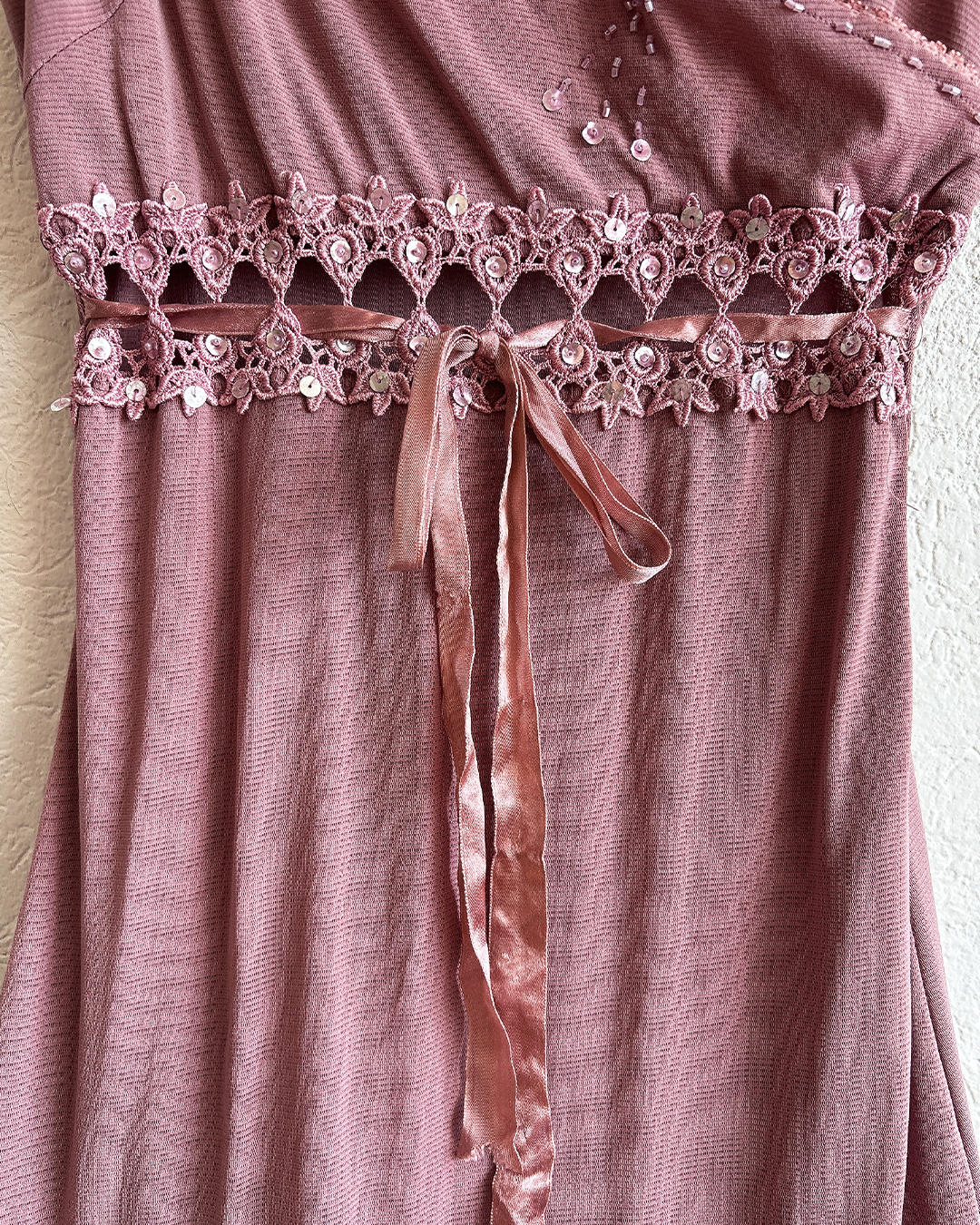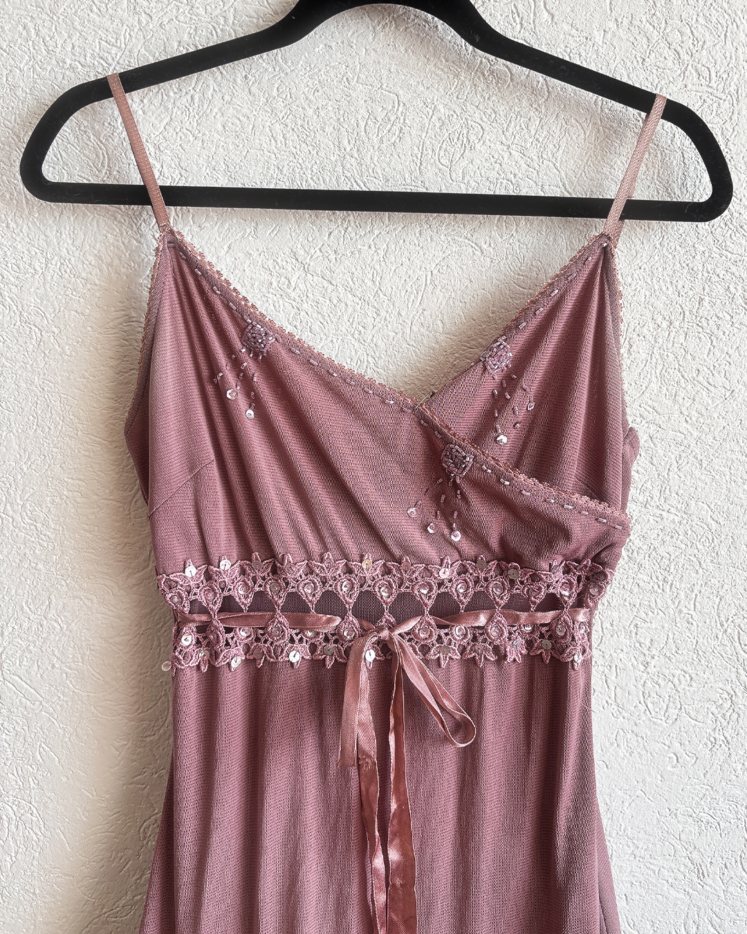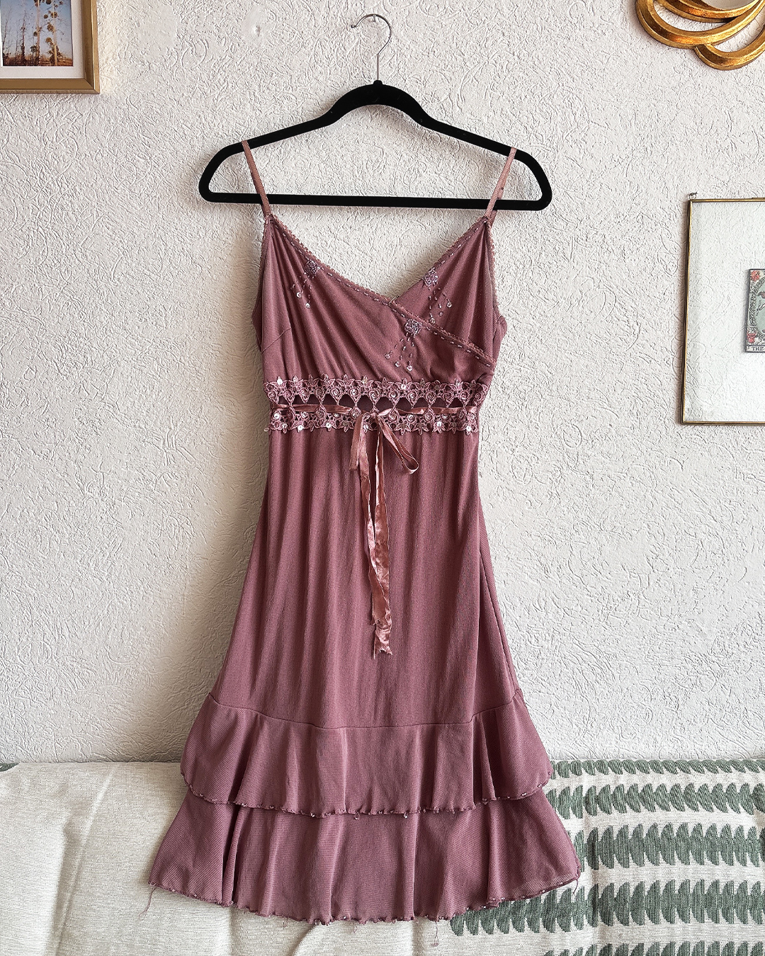 Vestido rosa empolvado estilo early 2000s con olanes y detalle de encaje. Caída suave y silueta muy bonita. El detalle bordado de enfrente es un sueño. Tirantes ajustables.