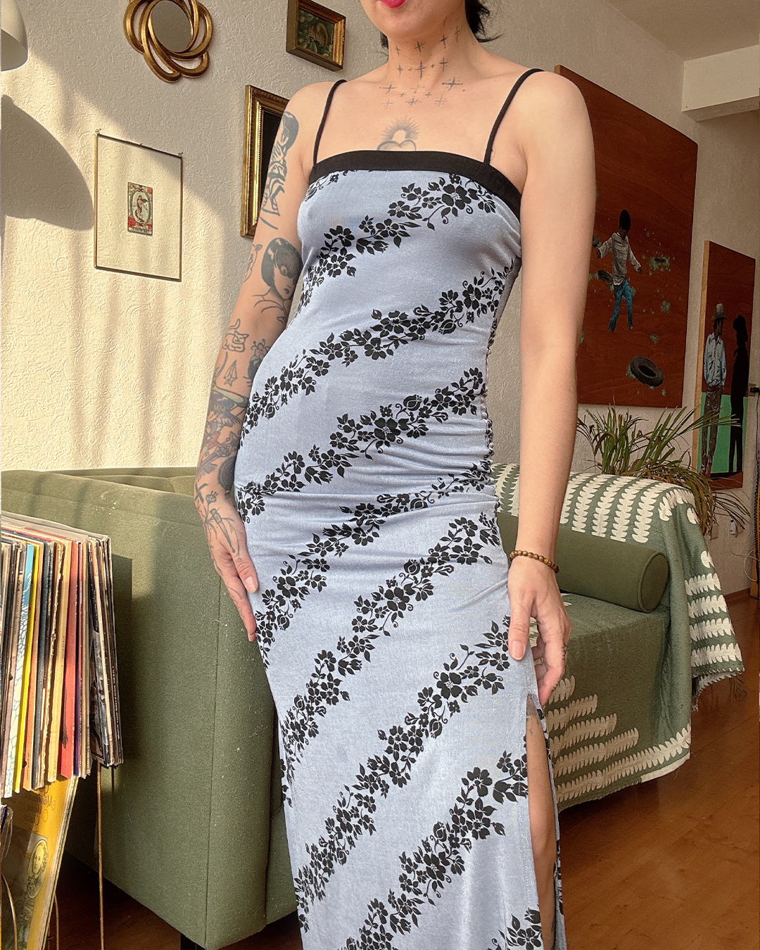 Vestido entallado de tirantes con abertura lateral. Estampa floral en contraste y silueta favorecedora. Brilla HERMOSO.