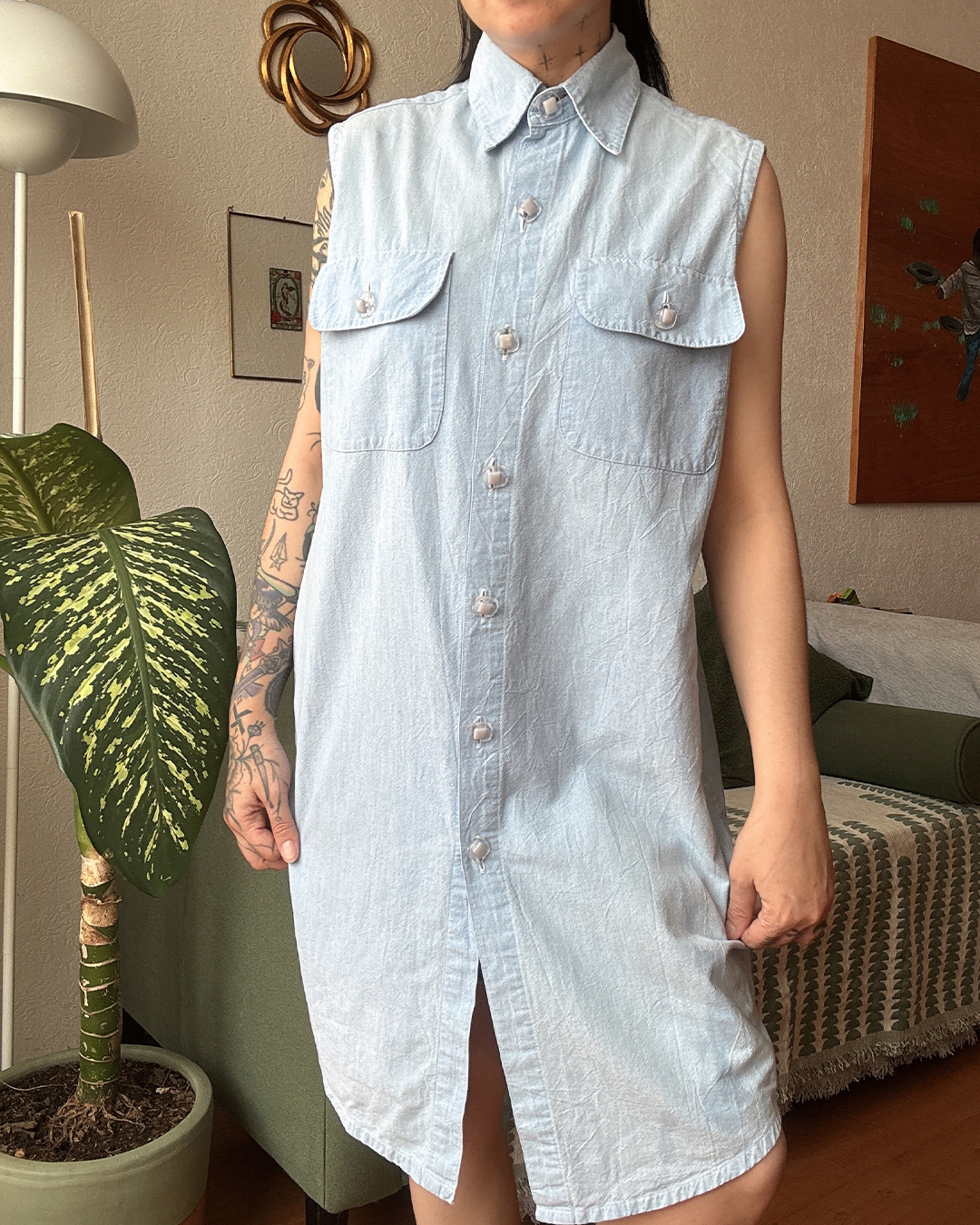 Vestido recto sin mangas confeccionado en mezclilla ligera de lavado claro. 100% algodón.